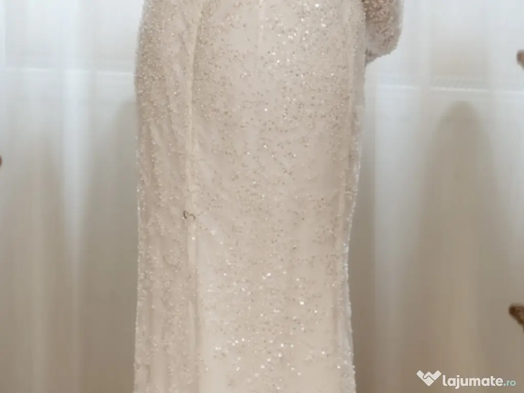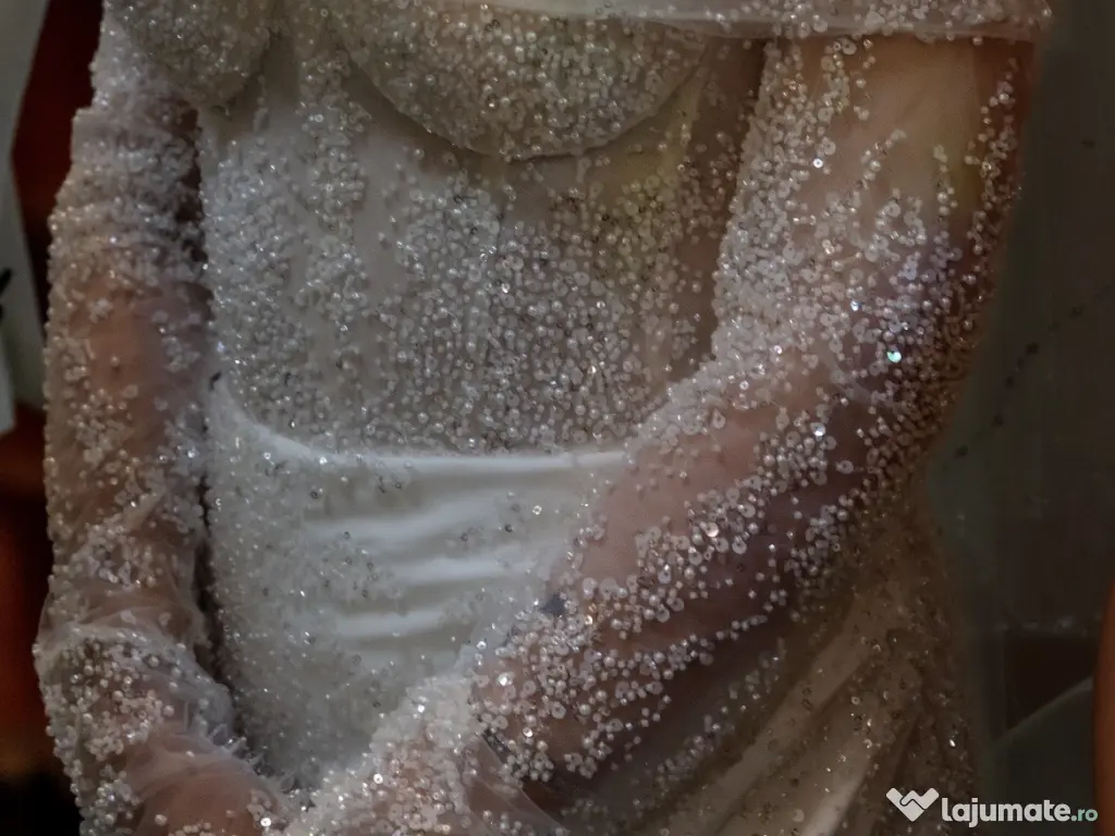 Rochie de mireasă elegantă, model sirenă, cu bust tip corset și aplicații fine din mărgele/perle pe întreaga suprafață. Prezintă slit pe picior și trenă delicată care se poate prinde la spate.