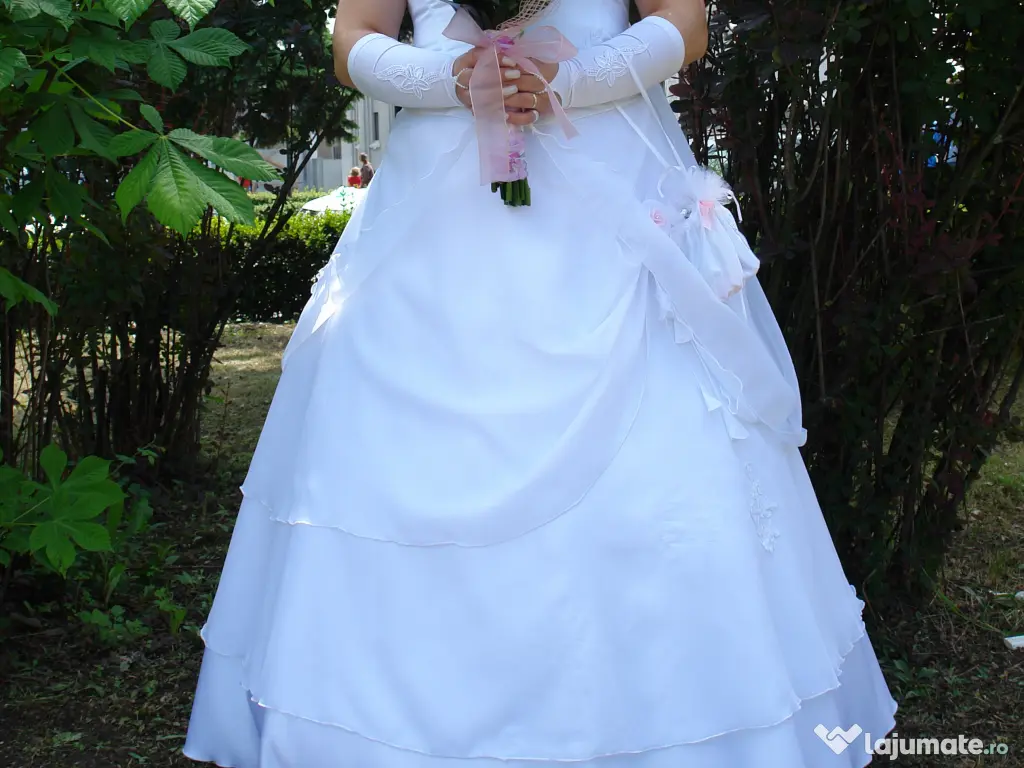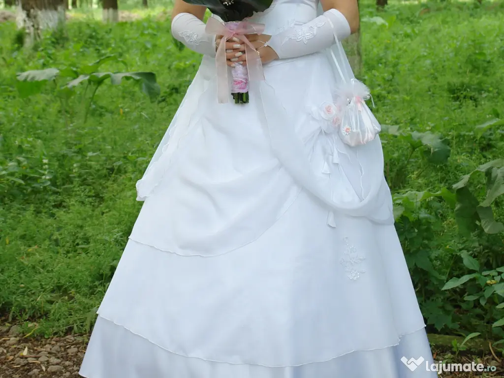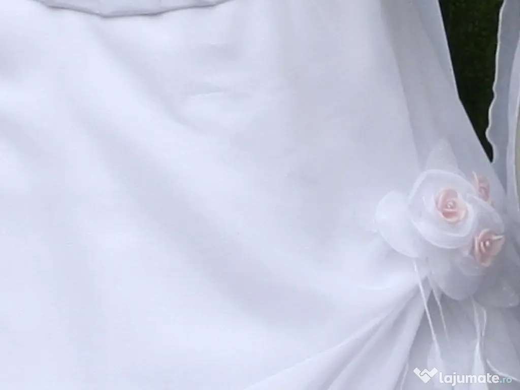 Rochie de mireasa alba purtata o singura data, formata din fusta si corset. Are floricele albe, roz si broderie . Corsetul se inchide in spate cu fermoar si siret. Inaltime 1.55-1.60. Se poate proba.