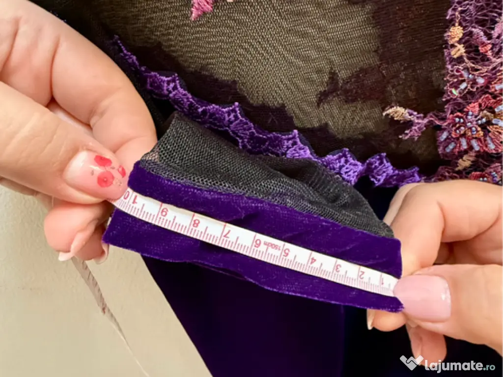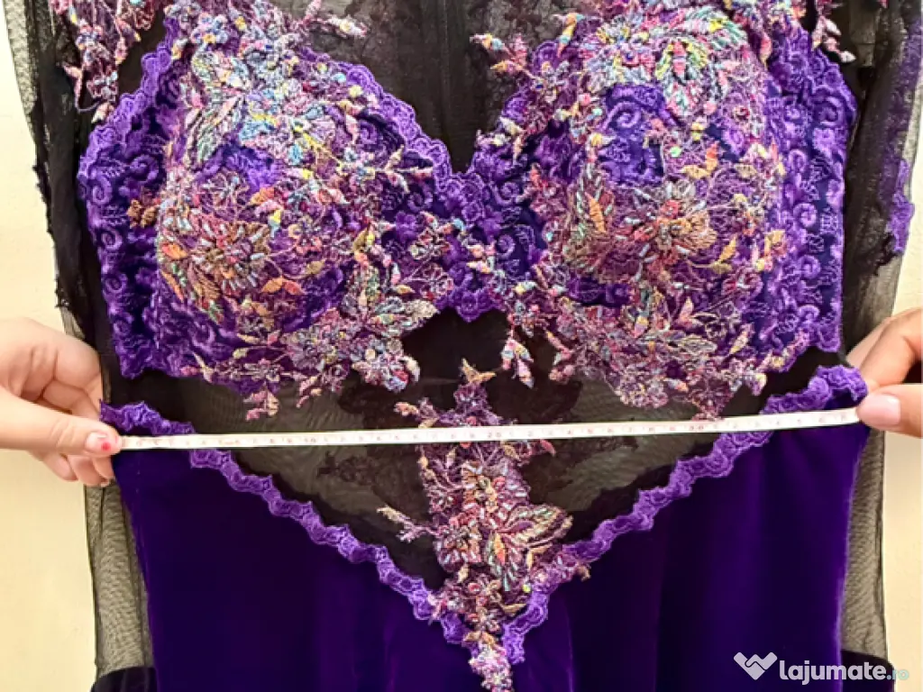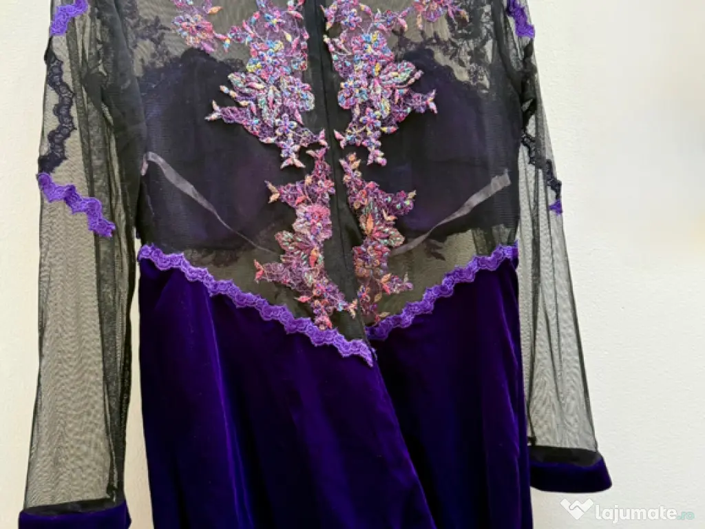 Material: Rochie de catifea subțire, cu mâneci din tulle elastic și dantelă aplicată manual.