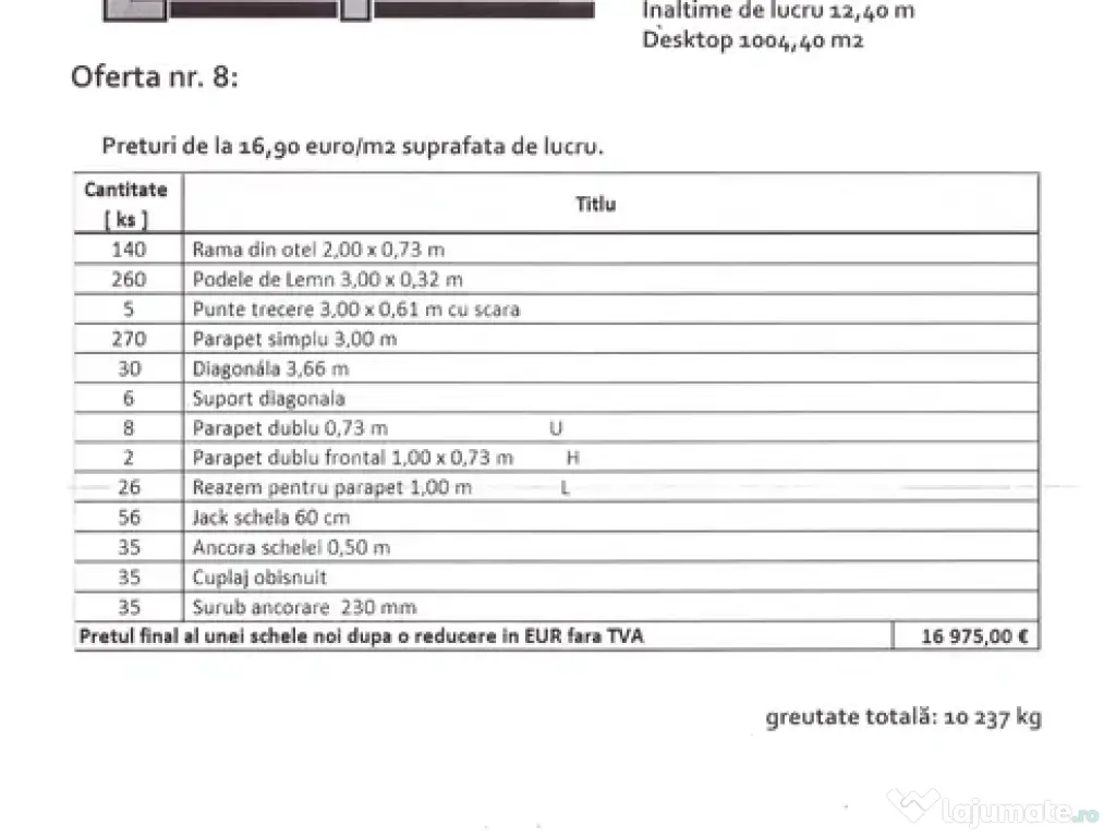 Oferte spre vânzare schelă nouă premium aprox. 1.000,00 m2, oțel galvanizat model Plettac, gamă profesională, cu toate accesoriile la un preț de 85,00 lei/m2 fără TVA.