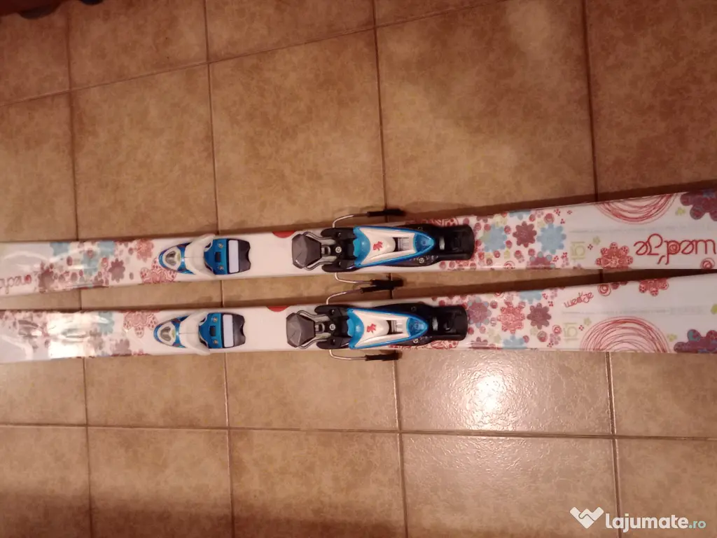 Doua perechi de schiuri de pista (lungime cca.159 cm), dintre care una noua -Rossignol- (1050 lei), cealalta- Wedze- in stare buna (450 lei); doua perechi de clapari dama, masura 40-41, dintre care una complet noua Wedze (350 lei) si cealalta, utilizata, Munari (100 lei).