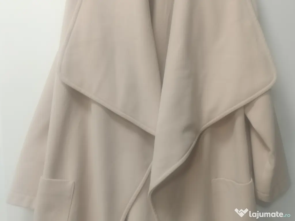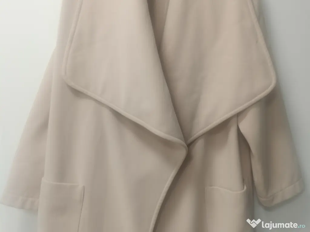 Palton de toamna bej, fără căptușeală, mărime universală, lungime trei sferturi, culoare plăcută bej- piersica, stofa moale cu revere largi, fără nasturi .