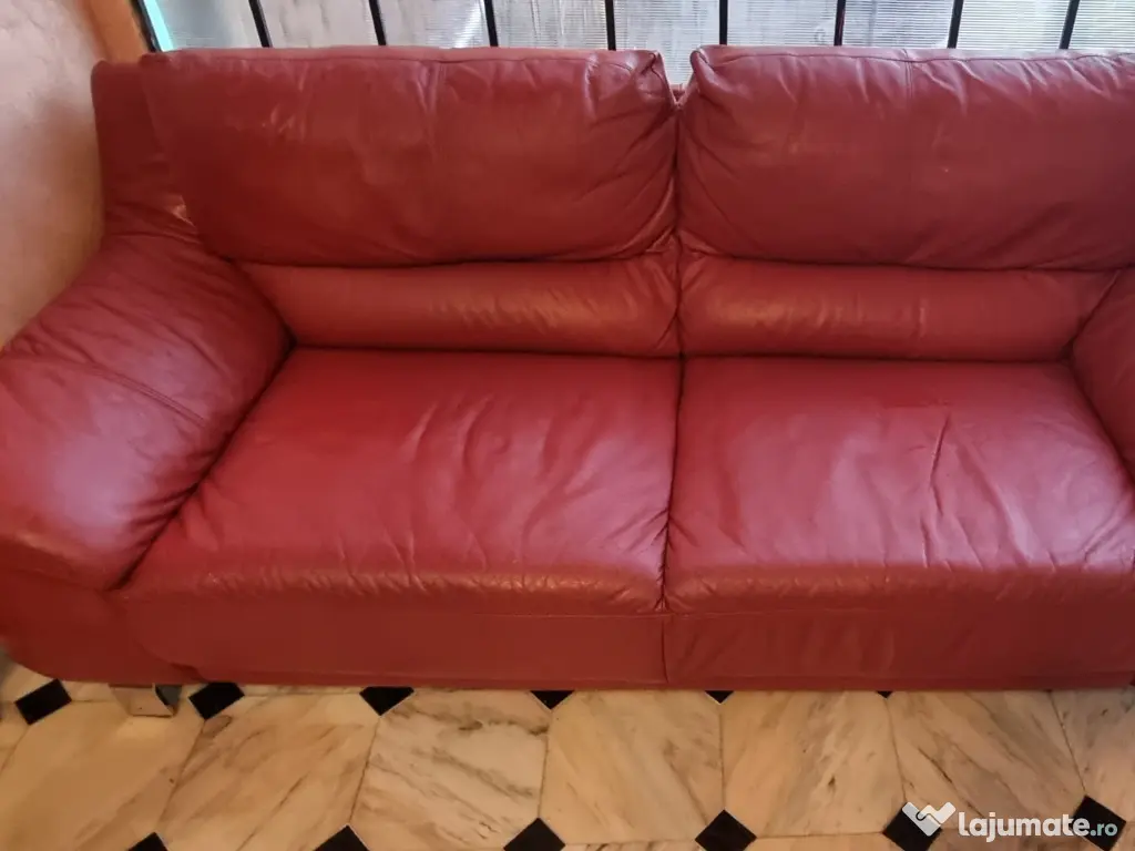 Vând set format din 2 canapele din piele naturală, într-o culoare roșie elegantă, ideale pentru living, birou sau spațiu de relaxare.