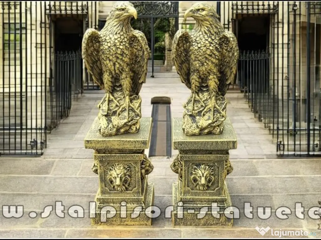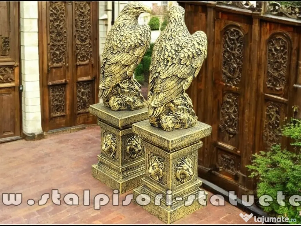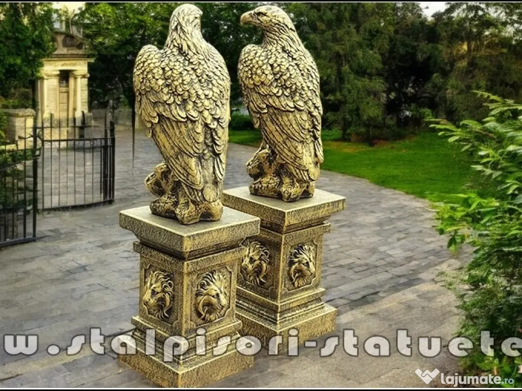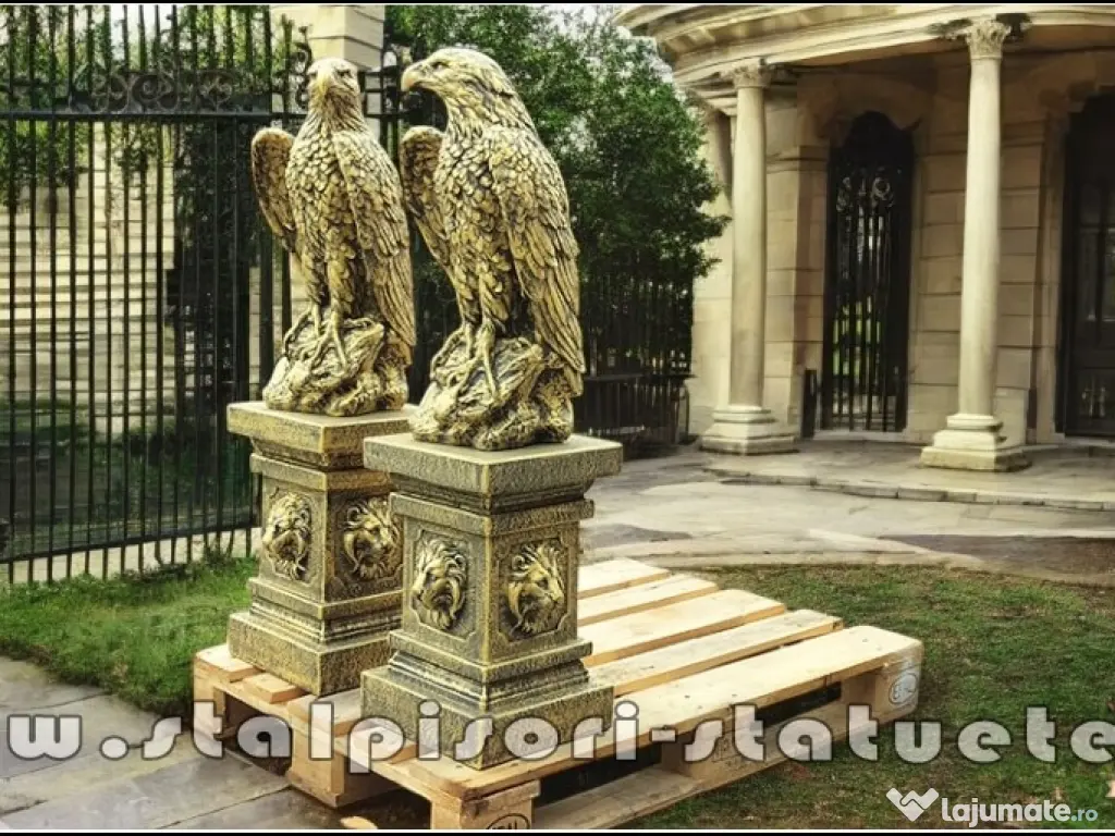 – DETALii TEHNiCE PRODUS: – LiVRARE GRATUiTĂ ORiUNDE ÎN ȚARĂ Preţ: 2.100 lei (set 2 bucăți vulturi+2 bucăți socluri.) Înălțime: 107 cm. Diametru bază vultur: 24×29 cm. Diametru bază soclu jos: 30×30 cm. Greutate: 190 kg. (set 4 bucăți.) Material: Beton aditivat, ciment 52,5 R, agregate concasate.