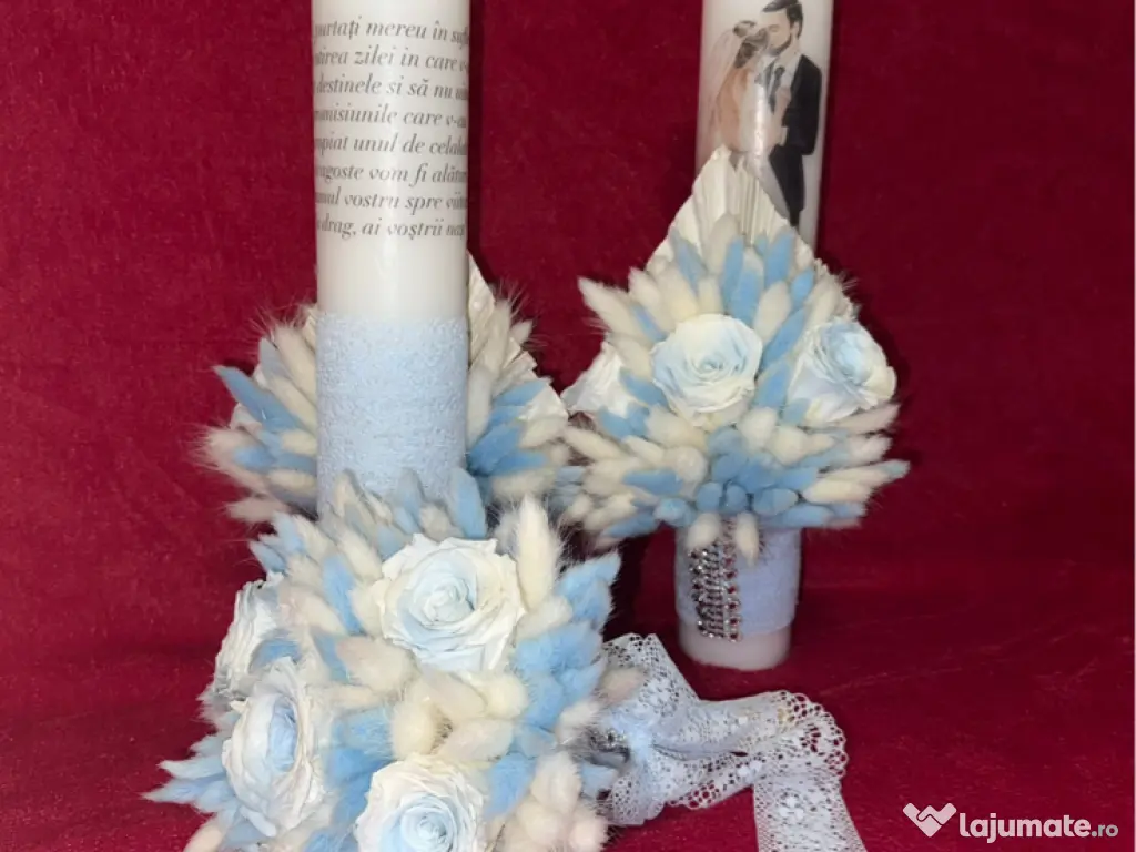 Vand set de lumanari de cununie culoarea babyblue create cu trandafiri criogenati si plante stabilizate in set este inclus si un buchet Se pot prelua comenzi si se pot realiza in functie de preferintele fiecaruia