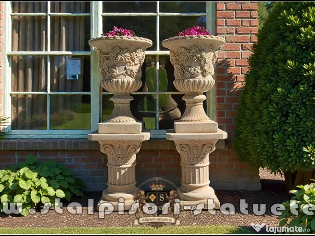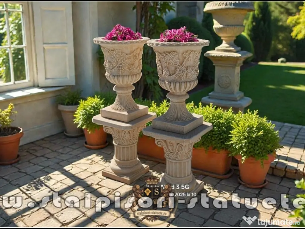– DETALii TEHNiCE Și iNFORMATiVE PRODUS: – Cod produs: MODEL V1-S6 Preț: 900 lei (set 2 bucăţi, 1 soclu+1 vază.) Detalii Tehnice vază: Diametru sus vază: 48x48 cm. Detalii Tehnice soclu: Diametru sus soclu: 44x44 cm. Înălțime: 127 cm. Greutate totală: 112 kg. Material: Beton aditivat, ciment 52,5 R, agregate concasate.