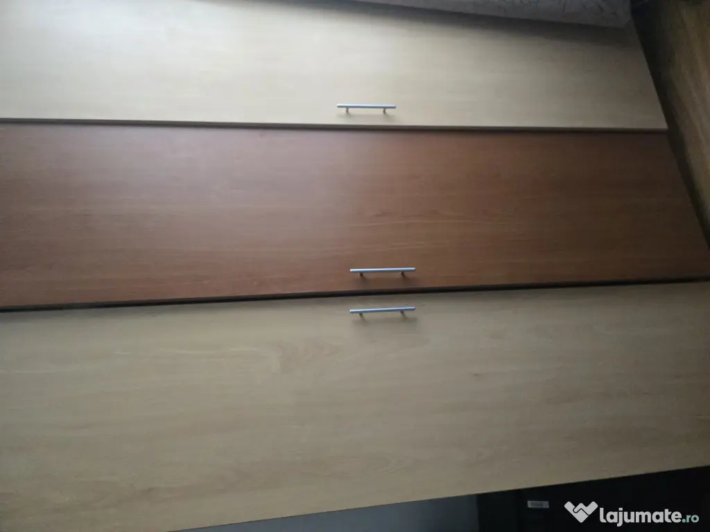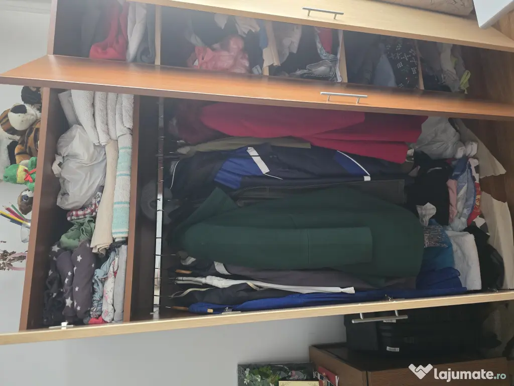 Șifonierul este din pal. Are 3 uși. 1 dintre uși este de la partea cu rafturi (are 4 rafturi), celelalte 2 uși se deschid în lateral, având 1 raft sus, iar dedesubt este partea pentru umerașe. Este în stare bună.