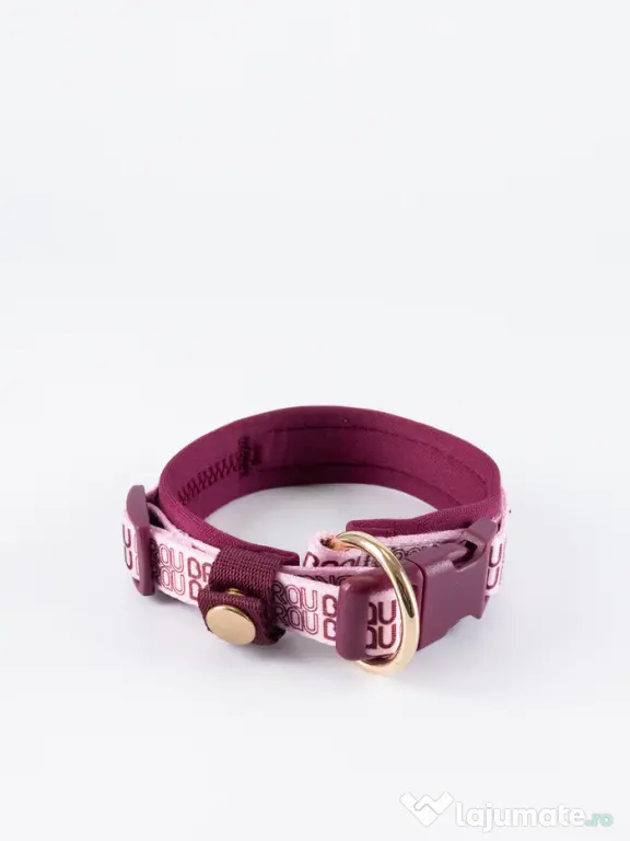 Zgarda este realizată din chingă textilă rezistentă, combinată cu strat interior din neopren pentru confort și protecție împotriva frecării. Sistemul de închidere utilizează o cataramă solidă din plastic și un mecanism de reglare pentru ajustarea dimensiunii. Inelul metalic permite prinderea sigură a lesei.