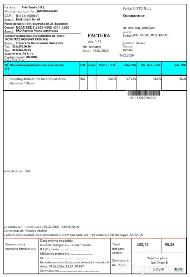 Produsul este aproape nou, desigilat. A fost achizitionat in 19.02.2026 de pe F64, la pretul de 550 RON (vezi factura in sectiunea de imagini), iar acum este vandut de F64 cu 660 RON.