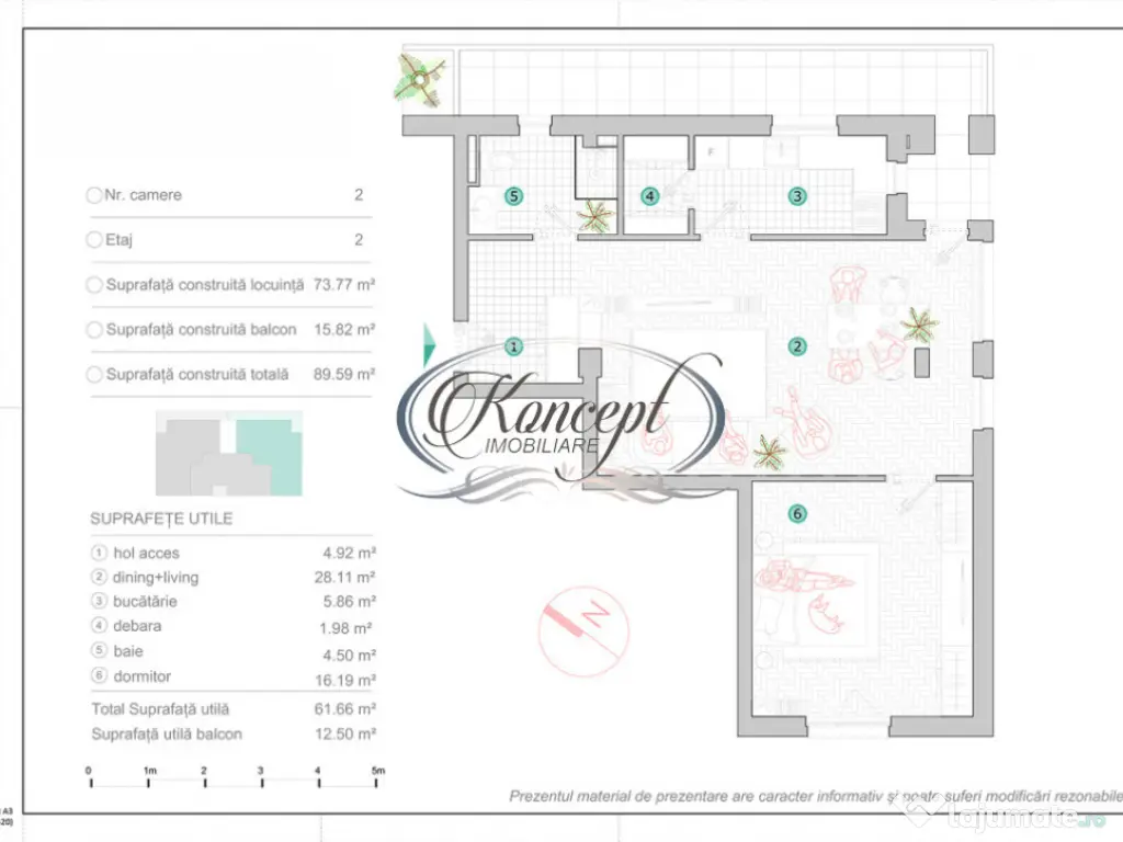 Koncept Imobiliare va ofera spre vanzare un apartament modern, intr-un complex rezidential smart house de tip boutique, intim, format din doar doua cladiri, fiecare cu cate 9 apartamente, amplasat pe Strada Oasului, in proximitate de CREIC. Apartamentul este situat la etajul retras al imobilului (demisol destinat parcarilor, apoi P+1+etaj retras), intr-o zona accesibila, cu conexiuni rapide spre punctele importante din oras, beneficiind de orientare Sud-Vest, ideala pentru lumina naturala si confort pe tot parcursul zilei. Proprietatea are suprafata utila de 61.66 mp, la care se adauga o logie de 12.50 mp. Compartimentarea este eficienta si echilibrata: hol, living cu bucatarie open-space, dormitor, baie si un dressing dedicat, un plus important pentru organizare si spatii de depozitare in interiorul apartamentului. Se preda la stadiul de semifinisat, cu sapa, doua maini de glet si instalatiile trase pe pozitii, oferind flexibilitate pentru amenajare dupa preferintele viitorului proprietar. Apartamentul se diferentiaza prin pachetul complet de tehnologie si eficienta: incalzire in pardoseala, centrala pe bloc cu contorizare separata, panouri fotovoltaice pentru consumul comun si clasa energetica A, pentru costuri optimizate. Sistemul smart include termostat smart, interfon, control acces, usa smart la intrarea in bloc, senzori de lumina, senzor de inundatie, senzor de prezenta, usa smart la intrarea in apartament, casute postale smart, control pentru incalzire si racire, plus instalatii pregatite pentru automatizari suplimentare. Constructia este realizata din caramida, cu izolatie din polistiren grafitat, fatada cu caramida aparenta, tamplarie PVC cu geamuri termopan tripan cu protectie UV si un nivel de antifonare ridicat, completate de zone verzi amenajate in jurul imobilului. Accesibilitatea este un avantaj major pentru un apartament pe Strada Oasului: statie de autobuz la 1 minut de mers pe jos, aproximativ 2 km pana la CREIC Cluj, 2.5 km pana la Auchan Iris, 6 km pana in centrul orasului (Piata Unirii), 7 km pana la Emerson si 10 km pana la Aeroport. Parcarile subterane se pot achizitiona separat, in functie de necesitate. Aceasta proprietate se recomanda celor care isi doresc un apartament smart in zona Oasului, cu orientare buna, comunitate restransa si eficienta energetica ridicata, potrivit atat pentru locuire pe termen lung, cat si pentru investitie, avand in vedere proximitatea fata de hub-uri de business si infrastructura urbana. Termen estimat pentru finalizarea constructiei: martie 2026, iar CF-urile sunt preconizate pentru iunie 2026. Actele au fost verificate si validate de catre agentie. Pentru informatii suplimentare, programarea unei vizionari sau pentru a afla oferta noastra completa va stam la dispozitie telefonic, prin e-mail sau la sediul agentiei noastre, pe str. Aviator Badescu, nr. 19, Cluj-Napoca. Id intern: P21082 Confort: 1 Tip imobil: Bloc de apartamente Număr Băi: 1 Comision cumpărător: 0%