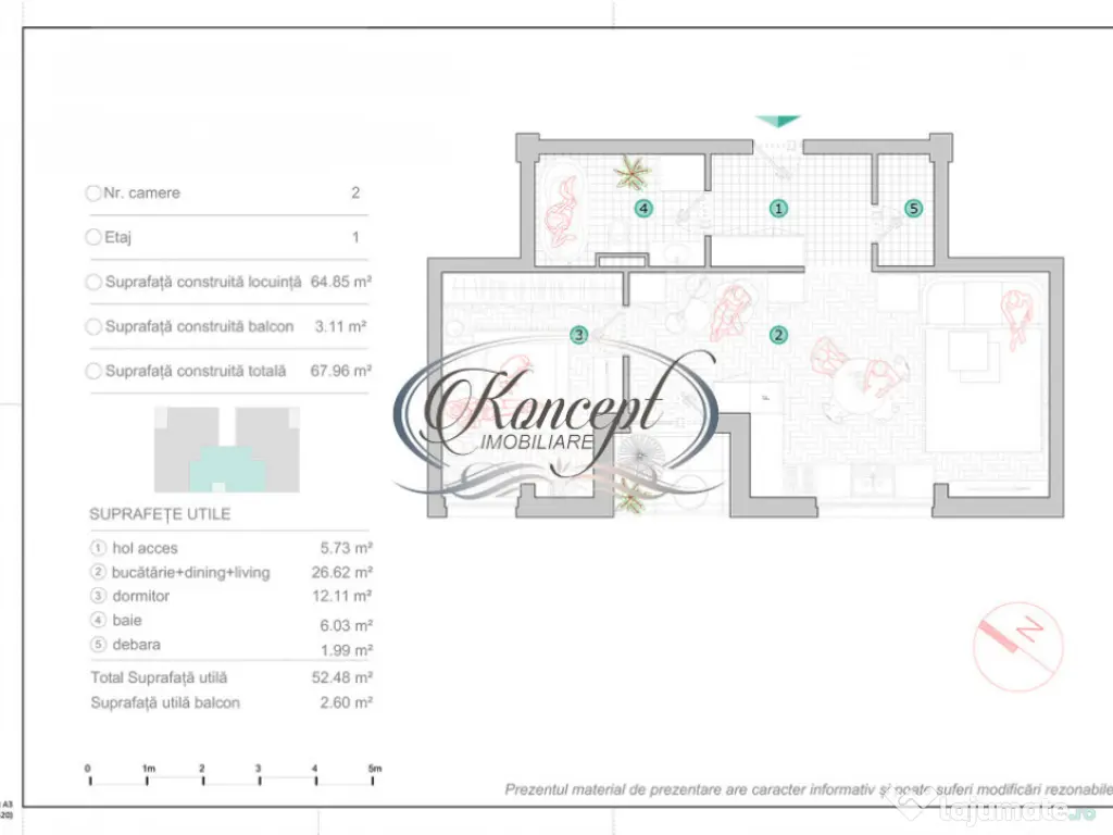 Koncept Imobiliare va ofera spre vanzare un apartament modern, intr-un complex rezidential smart house de tip boutique, intim, format din doar doua cladiri, fiecare cu cate 9 apartamente, amplasat pe Strada Oasului, in proximitate de CREIC. Apartamentul este situat la etajul 1 al imobilului (demisol destinat parcarilor, apoi P+1+etaj retras), intr-o zona accesibila, cu conexiuni rapide spre punctele importante din oras, beneficiind de orientare Sud-Vest, ideala pentru lumina naturala si confort pe tot parcursul zilei. Proprietatea are suprafata utila de 52.48 mp, la care se adauga o logie de 3.11 mp. Compartimentarea este eficienta si echilibrata: hol, living cu bucatarie open-space, dormitor, baie si un dressing dedicat, un plus important pentru organizare si spatii de depozitare in interiorul apartamentului. Se preda la stadiul de semifinisat, cu sapa, doua maini de glet si instalatiile trase pe pozitii, oferind flexibilitate pentru amenajare dupa preferintele viitorului proprietar. Apartamentul se diferentiaza prin pachetul complet de tehnologie si eficienta: incalzire in pardoseala, centrala pe bloc cu contorizare separata, panouri fotovoltaice pentru consumul comun si clasa energetica A, pentru costuri optimizate. Sistemul smart include termostat smart, interfon, control acces, usa smart la intrarea in bloc, senzori de lumina, senzor de inundatie, senzor de prezenta, usa smart la intrarea in apartament, casute postale smart, control pentru incalzire si racire, plus instalatii pregatite pentru automatizari suplimentare. Constructia este realizata din caramida, cu izolatie din polistiren grafitat, fatada cu caramida aparenta, tamplarie PVC cu geamuri termopan tripan cu protectie UV si un nivel de antifonare ridicat, completate de zone verzi amenajate in jurul imobilului. Accesibilitatea este un avantaj major pentru un apartament pe Strada Oasului: statie de autobuz la 1 minut de mers pe jos, aproximativ 2 km pana la CREIC Cluj, 2.5 km pana la Auchan Iris, 6 km pana in centrul orasului (Piata Unirii), 7 km pana la Emerson si 10 km pana la Aeroport. Parcarile subterane se pot achizitiona separat, in functie de necesitate. Aceasta proprietate se recomanda celor care isi doresc un apartament smart in zona Oasului, cu orientare buna, comunitate restransa si eficienta energetica ridicata, potrivit atat pentru locuire pe termen lung, cat si pentru investitie, avand in vedere proximitatea fata de hub-uri de business si infrastructura urbana. Termen estimat pentru finalizarea constructiei: martie 2026, iar CF-urile sunt preconizate pentru iunie 2026. Actele au fost verificate si validate de catre agentie. Pentru informatii suplimentare, programarea unei vizionari sau pentru a afla oferta noastra completa va stam la dispozitie telefonic, prin e-mail sau la sediul agentiei noastre, pe str. Aviator Badescu, nr. 19, Cluj-Napoca. Id intern: P21079 Confort: 1 Tip imobil: Bloc de apartamente Număr Băi: 1 Comision cumpărător: 0%