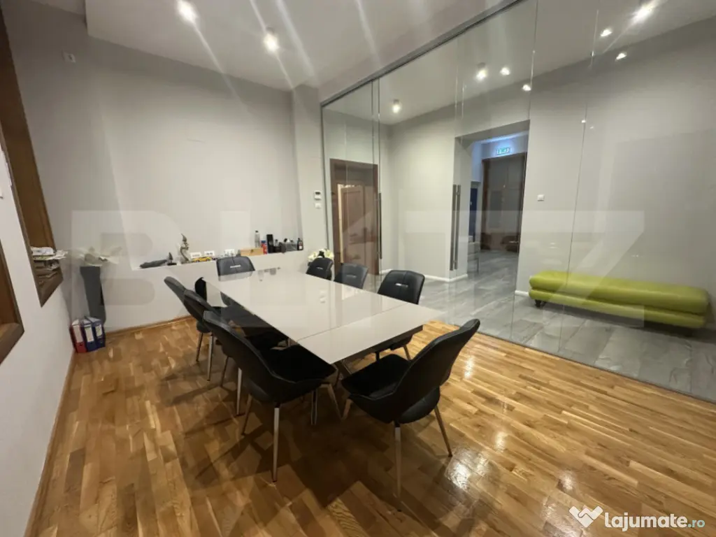 Blitz vă oferă spre închiriere o cameră foarte drăguța de birou în incinta unui spațiu comercial elegant din faimosul Palat Stern. Spațiul este compus din 4 birouri separate, o sală de conferință, un spațiu de așteptare generos, 3 bai, și o bucătărie la care veți avea acces. Camerele de birou se oferă nemobilate. Există și posibilitatea de a se închiria o a doua cameră, la un preț total de €700 + TVA, având toate utilitățile și costurile de întreținere incluse.