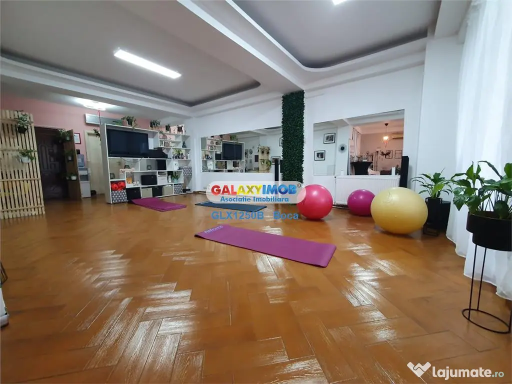 Spatiu pretabil pentru birouri, cabinete etc situat la etajul 1 al unei vile edificata in 2003. Spatiul propus spre inchiriere, ocupa intregul etaj 1, are hol, o camera mare din care se intra in bucatarie si in balconul inchis. Din hol se intra in alte trei camere si in una din bai, iar una din camere are baie proprie. Spatiul dispune de 4 aparate de aer conditionat, iar incalzirea este asigurata de centala imobilului. In prezent balconul si bucataria sunt utilizate ca saptii de depozitare.
