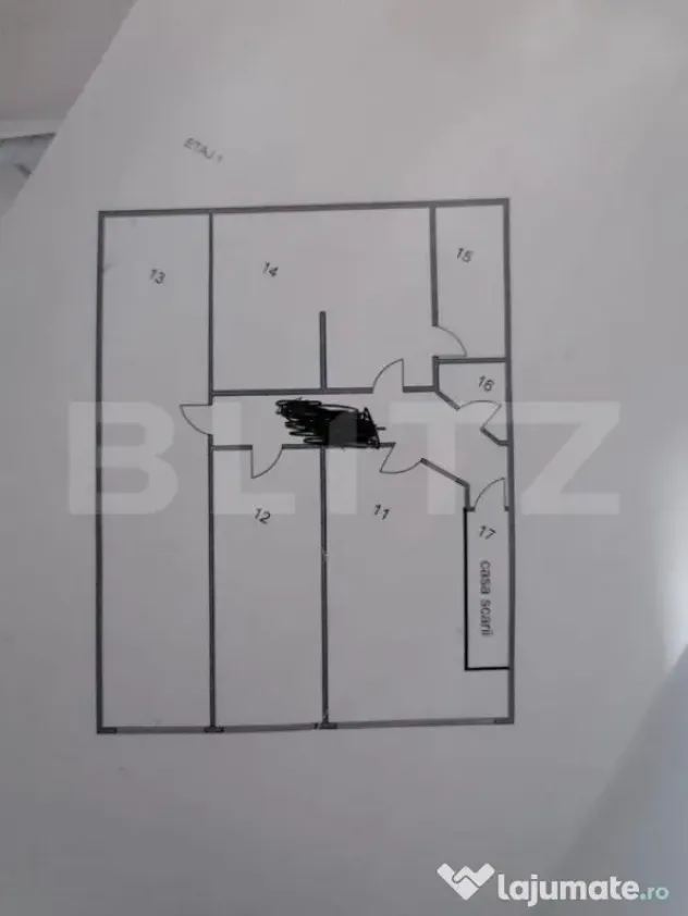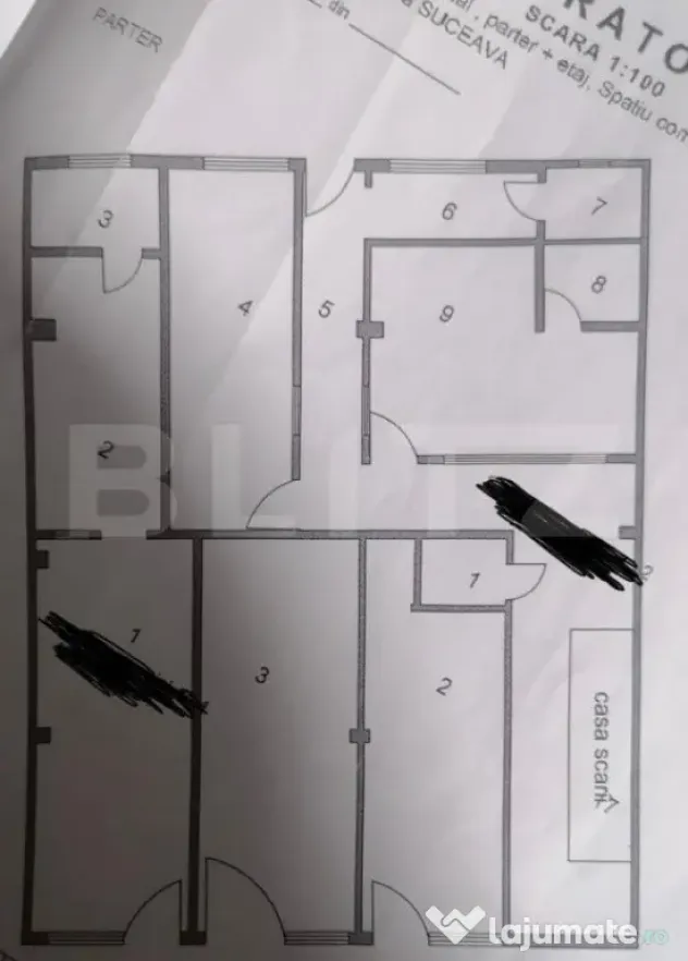 - etaj; casa scarii, hol, 2 bai dintre care una cu cada, bucatarie, balcon si 5 camere spatioase dintre care 3 cu vitrina la aleea pietonala