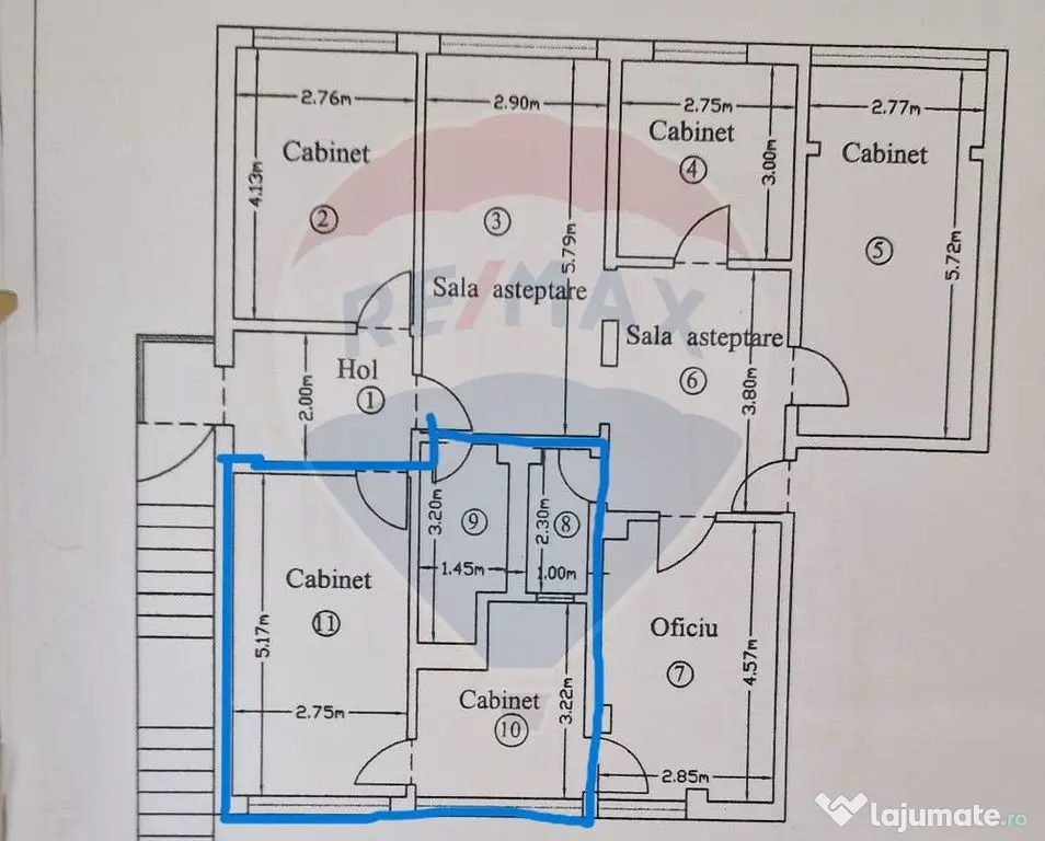Spațiul este compus conform planului releveu din încăperile numerotate 10 și 11 și beneficiază de o compartimentare practică, incluzând hol de acces și sală de așteptare. De asemenea, există acces la două grupuri sanitare comune, unul destinat personalului și unul pentru clienți/pacienți, oferind astfel un plus de confort și funcționalitate.