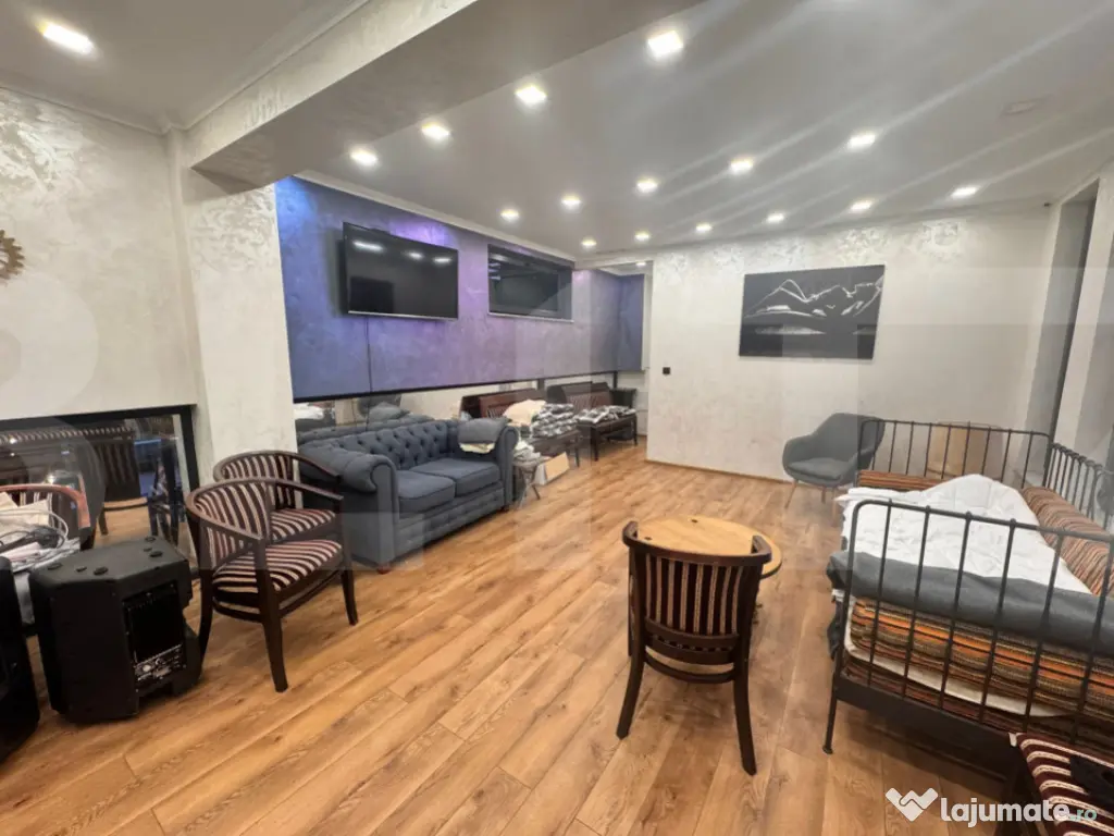 Blitz oferă spre inchiriere un spațiu comercial cu oportunitate de afacere, ideal pentru evenimente, restaurant, cafenea premium sau locație de agrement. Proprietatea dispune de o construcție solidă din cadre de beton și BCA, cu pereți placați cu cărămidă, având o suprafață generoasă de 275 mp și o terasă impresionantă de 450 mp, amenajată complet și pregătită pentru utilizare imediată. În exterior este amenajată și o bucătărie de vară de 24 mp, iar peisagistica se întinde pe aproximativ 1.150 mp, creând un cadru natural primitor și elegant. Spațiul este complet dotat și funcțional, fiind echipat cu cuptor pe vatră, cuptor industrial de pizza, instalație trifazică, aer condiționat, climatizare cu ventilator, centrală pe gaz, încălzire cu recuperator de căldură și boiler pentru apă caldă. Dispune de bar și mobilier din lemn masiv, minibar exterior pe terasă, sistem audio profesional, proiectoare pentru lumini ambientale și terasă mobilată cu copertine – perfectă pentru sezonul cald. Clădirea beneficiază de geamuri din sticlă termoizolantă (două, respectiv trei rânduri în anumite zone), sistem de supraveghere video, alarmă, climatizare controlată și toate autorizațiile ISU necesare, ceea ce permite preluarea și funcționarea imediată, fără investiții majore. Este, fără îndoială, o oportunitate excelentă pentru cei care doresc să intre direct în activitate fără costuri suplimentare — un spațiu complet operațional, modern, sigur și perfect pus la punct, gata să genereze profit din prima zi. Cod ofertă / ID BLITZ: P166942 Id intern: P166942 Suprafaţă totală: 300 m² Stadiu construcţie: Finalizat Tip imobil: Centru comercial