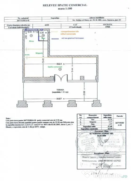 Spațiul are o suprafață utilă de 60 mp compus dintr-o cameră, baie, cu centrală termică. Spațiul are accesoriu ca folosință și o terasă exterioară, care coroborate însumează o suprafață totală de 100 mp și cotă parte teren.