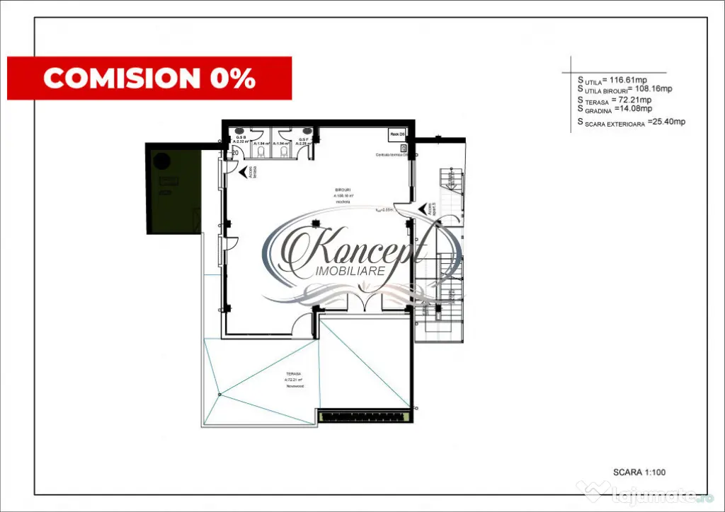 Koncept Imobiliare va ofera spre inchiriere un spatiu pentru activitati de birouri in imediata vecinatate a hotelului Belvedere. Spatiul este situat intr-o cladire administrativa, are suprafata utila de 116.61 mp si este compus dintr-un open-space, 2 grupuri sanitare si zona unde se poate amenaja o chicineta. Totodata in pretul spatiului este inclusa si o terasa de 72.21 mp ce ofera una dintre cele mai spectaculoase vederi din Cluj-Napoca. Spatiul este in curs de renovare, este disponibil imediat si se preteaza perfect pentru orice tip de activitate de birou, cu sau fara public. Pentru informatii suplimentare, programarea unei vizionari sau pentru a va prezenta oferta noastra completa, nu exitati sa ne contactati telefonic, prin e-mail sau la sediul agentiei noastre de pe str. Aviator Badescu nr. 19, Cluj-Napoca.