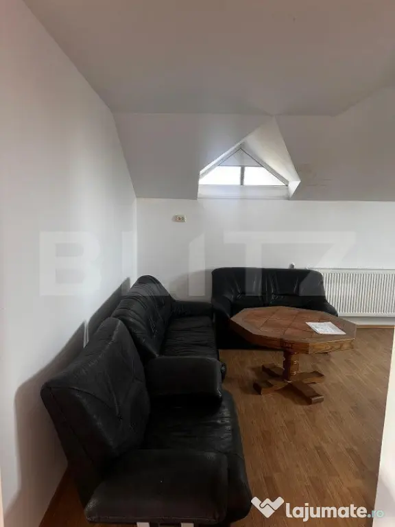 Mansardă Mobilată parțial, inclusiv un spațiu de birou și o baie, ideală pentru birouri sau zone de lucru.