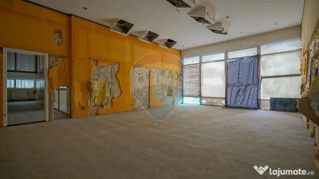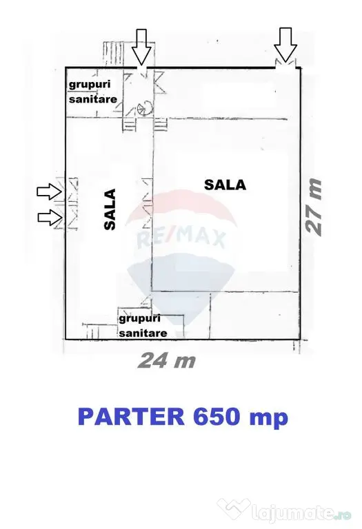 Parterul de 650 mp include două săli de mari dimensiuni și două grupuri sanitare, asigurând spațiul necesar pentru depozitare voluminoasă, producție sau amenajarea unui showroom extins. Accesul către etaj este realizat prin două scări interioare.
