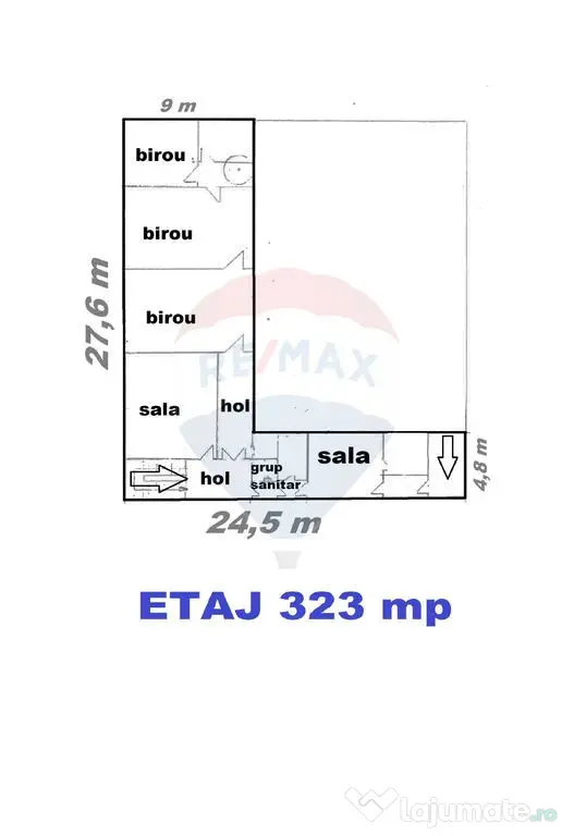Etajul de 323 mp cuprinde trei birouri, două săli suplimentare, un hol și un grup sanitar, fiind ideal pentru amenajarea spațiilor administrative și suport logistic.