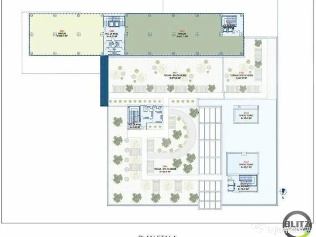 Cladire de birouri clasa A+ va ofera o suprafata de 1500 de mp, situati la etajul 1 al cladirii, sub forma de open space cu multiple accese ( 3 lifturi) si cu inaltime de 2.75. Exista un numar total de 313 locuri de parcare aferente cladirii si parcare pentru biciclete. Cladirea are 2 scari exterioare si o terasa verde la etajul 3. Spatiul se preda cu podea tehnologica, doar pe spatiile de lucru , punct de incarcare admisa : >2.0kN la max. 2 mm indoire, sarcina utila admisa: 3.0 kN/m2 evaluare la foc: B1, Q1, nivel zgomot 25 Db, h = 11.5-12 cm , adaposteste curenti slabi, tari si fibra optica + cablu UTP, mocheta si tavan fals cu sistem de iluminat. Cladirea dispune de : -doua circulatii auto: una la subsol pentru parcarea subterana si una terana perimetrala cladirii. -Instalatii : HVAC controlate prin BMS cu ajutorul senzorilor de temperatura externi si interni privind calitatea aerului si temperatura, toate valorile masurate vor fi transferate printr-un protocol de comunicatie din echipamentul tehnic si inregistrat, rezerva pentru extensiile viitoare, BMS central alimentat prin intermediul sursei de alimentare de urgenta. control acces prin cartela personalizata in orice zona a cladirii si perimetral, pe nivele de acces/securitate/intervale orare/zile/ etc. camere de supravegheat analogice cu lentile varifocale , min. 1200 linii TV, infra color, actionate automat pentru suprvegherea urmatoarelor spatii : (intrarile constructiei, bariere de acces parcari subterane si turnicheti parter, linii de conducere in parcari, spatiile comune, inregistrare min. 30 de zile, sistemul este modular extensibil max 1000 de dispozitive de ultima generatie ) Sistem cu Economie de energie -convertor de recuperare a cladirii , minim 70 % fara recuperare de umiditate, recuperarea caldurii prin intermediul sistemului conectat de circuit CSC aprox. 30 %. Iluminat: led pentru spatiile de lucru 500 lux. Lumina de urgenta sistem central-sistem de baterii ( linie de control) UPS Alimentare electrica capacitate 2 x 1600 kva. Alarma: sistem de alaram pentru toate inrarile in cladire, camere tehnice, camera de securitate dispecerat ISU Centrala PSI independenta proiectat conform EN 12845, Vds CEA 4001, cerinta FAM si reglementarile din Romania, sistem centralizat cu senzori de fum, foc si gaz, sistem de drenare si sprinklere la etajele superioare, parcare subterana si magaziile de la subsol-sistem umed, rezerva de apa 350 mc situata extern in Piazzeta. Cladirea dispune de generator propriu de 350 kva. Spatiul este aproape de mijloacele de transport in comun . Aceasta pozitionare impreuna cu parcarea de biciclete si punctele de incarcare electrica, incurajeaza folosirea mijloacelor de transport alternative si contribuie la reducerea emisiilor poluante si imbunatatirea calitatii vietii. Terasele generoase, piazzeta si imprejurimile incurajeaza chirasii sa-si petreaca timpul in aer liber. Taxa de administrare este de 2.2 eur/mp. Cod ofertă / ID BLITZ: P3421 Id intern: P3421 Stadiu construcţie: Finalizat Tip imobil: Bloc de apartamente