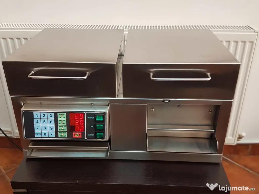 Panoul de comanda numeric cu display, este ușor de folosit și asigură setarea la secundă a timpilor stabiliți. În timpul aplicării de polimer se pot ivi bule de aer. Pentru eliminarea lor, mașina este prevăzută cu un compresor care transmite un jet de aer sub presiune pentru a sparge aceste bule, prin simpla apăsare a unui întrerupător și direcționarea unui furtun prin care circul aerul. După expunerea amprentei la UV, mașina are o cuvă de spălare și îndepărtare a materialului de polimer care nu este necesar. Pentru a obține o amprentă de calitate, mașina este prevăzută cu un sertar postexpunere pentru a se obține o amprentă mai dură. După operația de întărire a amprentei, mașina are un sertar cu ventilație caldă pentru uscare.