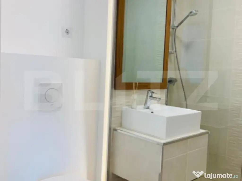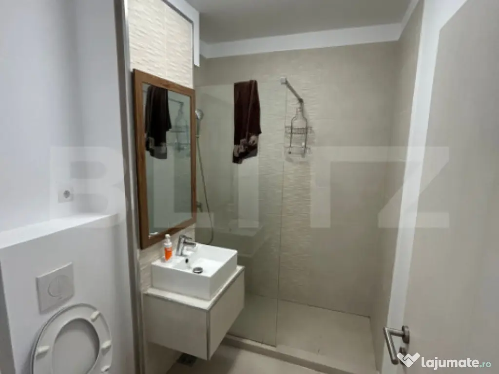 Blitz va propune spre vânzare un apartament tip studio complet mobilat și utilat ultramodern, situat la etajul 5 al unui bloc nou, cu lift– ideal pentru cei care caută confort, noutate și un cămin gata de mutat. Detalii apartament: Suprafață generoasă, compartimentare practică: – Living modern și luminos, open-space cu bucătăria – 1 Nisa de Dormit Baie elegantă, cu cabină de duș Terasa 42,6 mp + 5 mp balcon Dotări și beneficii: Mobilat complet, cu mobilier de calitate superioară Electrocasnice moderne – inclusiv mașină de spălat rufe, cuptor electric, plită Finisaje moderne Întreținere redusă, eficiență energetică ridicată Locație excelentă – într-un bloc nou, liniștit și bine poziționat: Aproape de facilități urbane: magazine, transport public, spații verzi, stație de autobuz Acces rapid către zonele de interes din oraș. Apartamentul se vinde de pe firma cu posibilitate de taxare inversa iar pretul este cu TVA inclus. Cod ofertă / ID BLITZ: P151461 Id intern: P151461 Confort: 1 Tip imobil: Bloc de apartamente Număr Băi: 1
