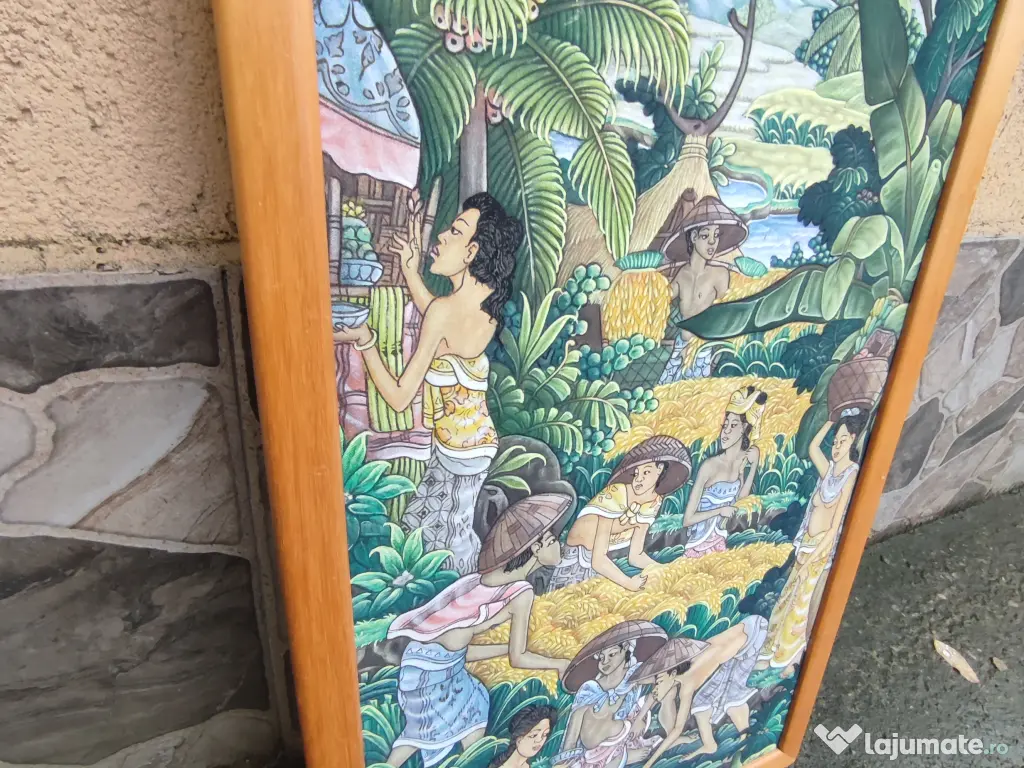 Scena redă oameni aflați la recoltarea orezului, într-un peisaj luxuriant în nuanțe intense de verde, galben și albastru, care creează o compoziție armonioasă și bogată vizual. Tonurile calde ale orezului proaspăt tăiat contrastează spectaculos cu vegetația densă, profund colorată, alcătuită din palmieri, bananieri și plante tropicale pictate cu o atenție minuțioasă la detalii. Fundalul este dominat de dealuri line și munți în nuanțe blânde, aproape pastelate, care dau profunzime scenei, în timp ce un râu senin traversează peisajul și adaugă o senzație de liniște. Personajele sunt îmbrăcate în haine tradiționale cu motive decorative, pictate cu culori vii și luminoase: tonuri de roz, galben, albastru, alb și tonuri pământii care se îmbină perfect cu mediul natural. Ele apar în diverse ipostaze; unele lucrează aplecate printre snopii aurii, altele poartă coșuri, discută sau privesc spre ceilalți, iar câteva poartă pălării conice tradiționale ce subliniază influența culturală asiatică. Chipurile lor sunt liniștite, expresive și conturate fin, sugerând bucurie, cooperare și un mod de viață comunitar, profund legat de natură. Întreaga compoziție este realizată într-un stil decorativ, specific artei tradiționale balineze sau indoneziene, caracterizat prin desenul bine conturat, dinamismul scenelor, abundența elementelor naturale și utilizarea culorilor saturate. Vegetația, țesăturile, arhitectura rustică, expresiile chipurilor și modul în care lumina se reflectă prin culori creează o imagine plină de armonie, viață și căldură.