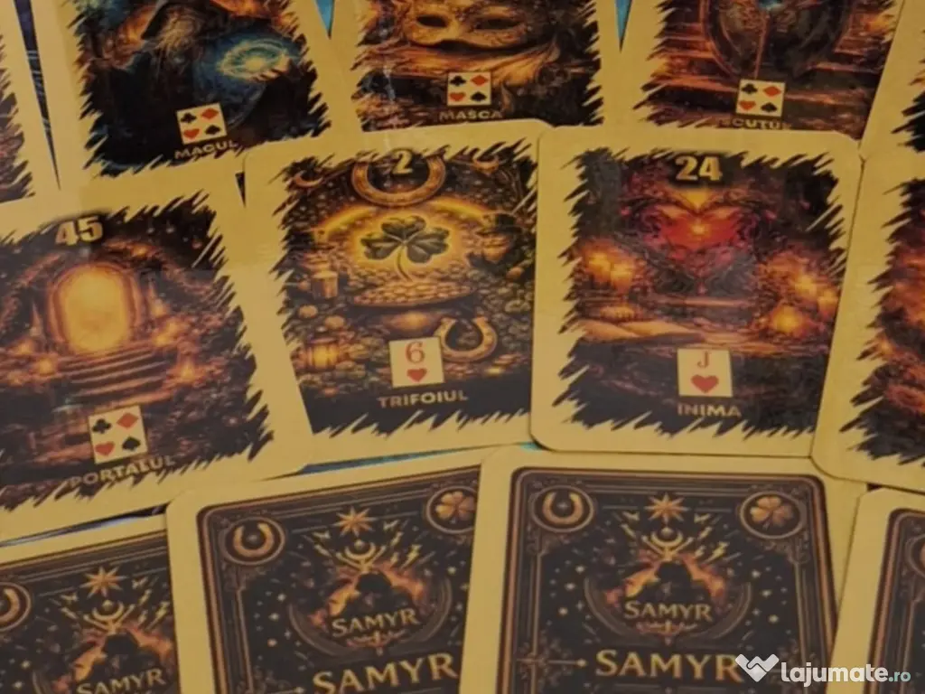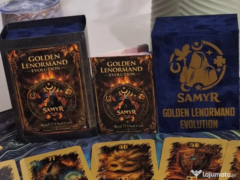 Golden Lenormand Evolution setul de Lenormand îmbunătățit extins până la 77 carti ,cu o imagistica deosebita, plastifiate aurii, setul vine însoțit cu o cutie catifelată si ghid interpretare carti.