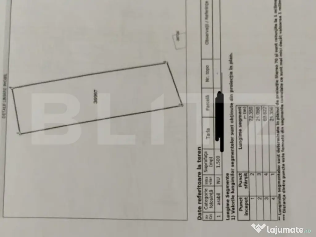 Blitz vă oferă spre vânzare teren intravilan, cu suprafața de 1.500 mp, înscris în Carte Funciară, cu documentație cadastrală completă și acte în regulă. Caracteristici teren: Suprafață totală: 1.500 mp Categoria de folosință: Intravilan Curent electric disponibil în zonă Formă regulată, ideală pentru utilizare eficientă Acces facil Delimitare cadastrală realizată Parcelă individuală (Tarla 55, Parcela 21) Avantaje: Acte pregătite pentru vânzare Potrivit pentru investiție, agricultură sau proiecte viitoare Zonă cu potențial de dezvoltare Cod ofertă / ID BLITZ: P161812 Id intern: P161812