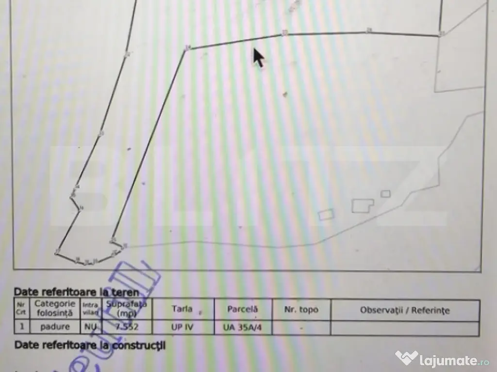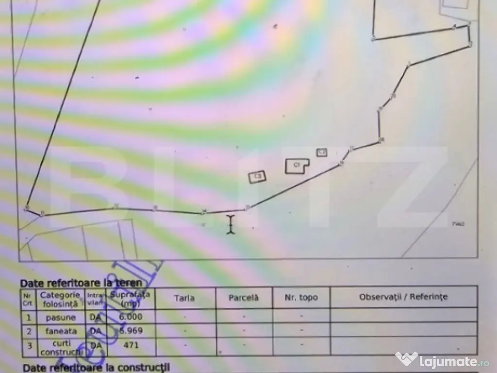 ???? Blitz vǎ propune un teren deosebit cu pădure proprie și priveliște superbă la munte – liniște, natură și intimitate O oportunitate rară pentru iubitorii de natură! Se vinde proprietate formată din două parcele, cu suprafață totală de 19.992 mp, situată într-o zonă liniștită, cu priveliște spectaculoasă către munți și dealuri, ideală pentru locuință de vacanță, cabană turistică sau investiție. ???? Parcela 1 – Teren intravilan (12.440 mp) Pe teren se află: Casă din lemn, cu 56 mp suprafață la sol, compartimentată în 2 camere locuibile, perfectă pentru relaxare sau locuire temporară Încălzire cu sobă pe lemne, atmosferă autentică de cabană Anexă de 26 mp, utilizată ca bucătărie de vară ???? Parcela 2 – Pădure de brad (7.552 mp) Pădure proprie de brad, ideală pentru relaxare, plimbări sau pentru a vă bucura de aer curat și intimitate. ???? Acces facil din două drumuri: acces în partea de jos a proprietății, spre pădure acces în partea de sus, spre terenul intravilan Drumurile sunt pietruite, cu proiect de asfaltare în curs. ???? Utilități: Apă trasă în curte Sursă de apă naturală prin curgere, utilizată în comun cu mai mulți vecini ✨ Avantaje: suprafață mare de teren pădure proprie priveliște panoramică spre munți și dealuri zonă liniștită, cu aer curat acces din două părți ideal pentru cabană, pensiune, casă de vacanță sau investiție turistică ???? Locul perfect pentru cei care își doresc liniște, natură și un refugiu departe de aglomerația orașului. ???? Pentru mai multe detalii sau programarea unei vizionări, nu ezitați să ne contactați. Cod ofertă / ID BLITZ: P166353 Id intern: P166353