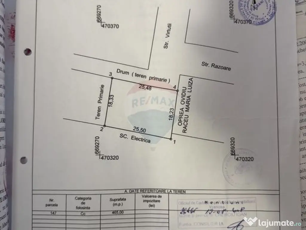 Comision 0% Va propun spre vanzare un taren in Focsani , zona Castelul de Apa , strada Vrancei! Situat pe strada Virturii , terenul are o suprafata de 465 mp , cu o deschidere de 25,48 metri! Aceesul se face pe drum pietruit ( drum comun ) Se invecineaza pe spate cu SC Electrica! Pentru detalii va stau cu drag la dispozitie!