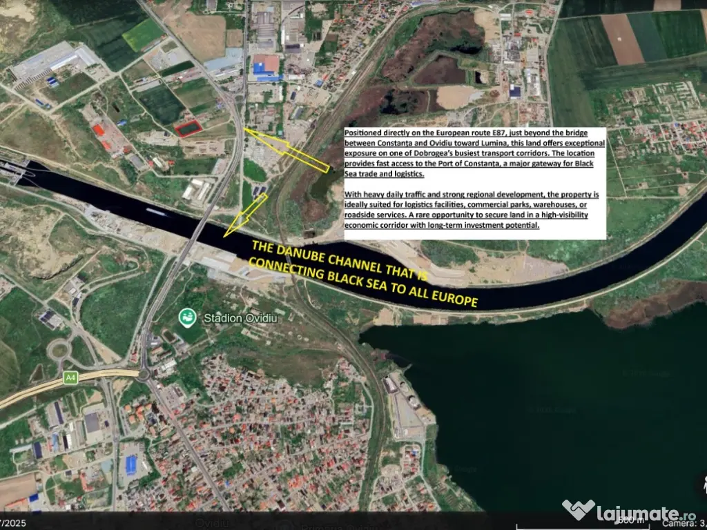 Se oferă spre vânzare teren intravilan cu suprafața de 5.500 mp, situat într-o poziție strategică în Ovidiu, la aproximativ 140 m de DN2A și foarte aproape de nodul rutier al Autostrăzii A2.