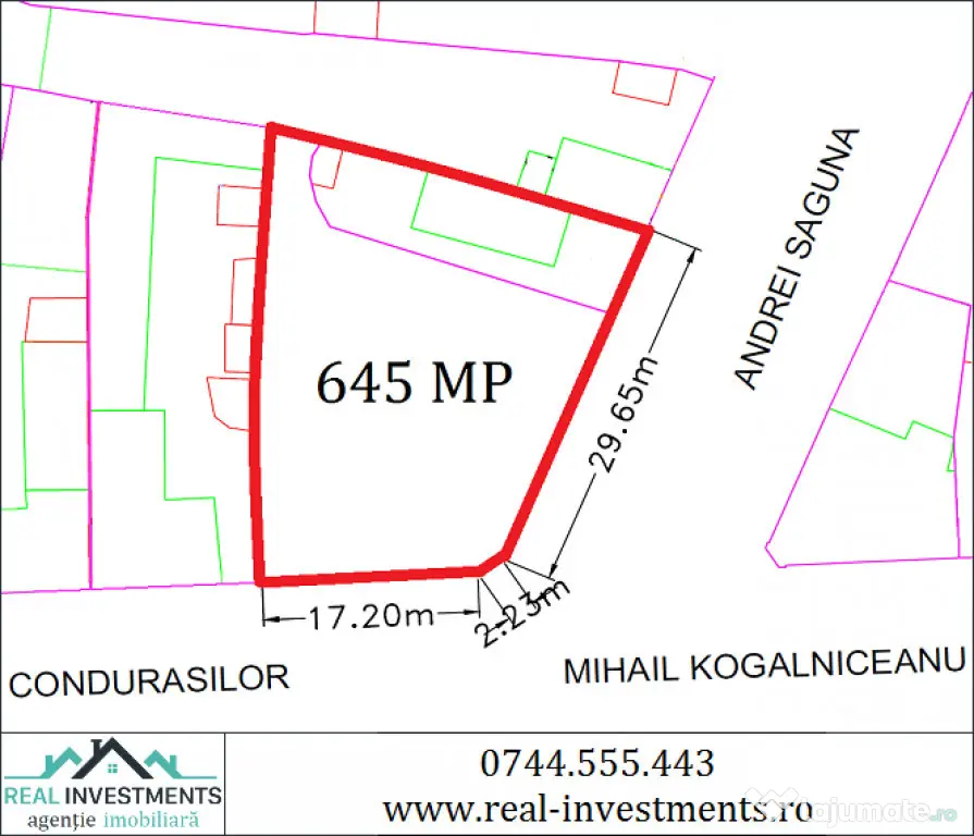 Vand teren zona Parneava, suprafata 645 mp, cu 2 fronturi stradale pe Andrei Saguna si Mihail Kogalniceanu, recomandat pentru constructii de case, blocuri, spatii comerciale, utilitati: apa, gaz, curent, canalizare.