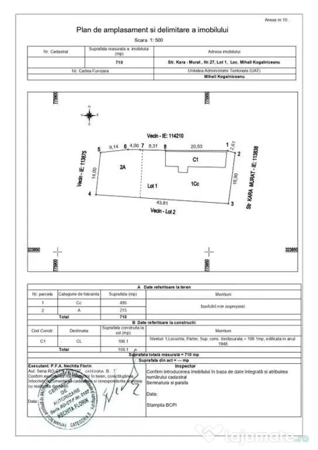 Vă prezentăm spre achiziție un teren intravilan generos în suprafață de 710 mp, situat într-o zonă de case liniștită din localitatea Mihail Kogălniceanu (Str. Kara-Murat nr. 27). Este locația ideală pentru cei care își doresc o locuință individuală departe de agitație, dar cu acces rapid către DN 2A.