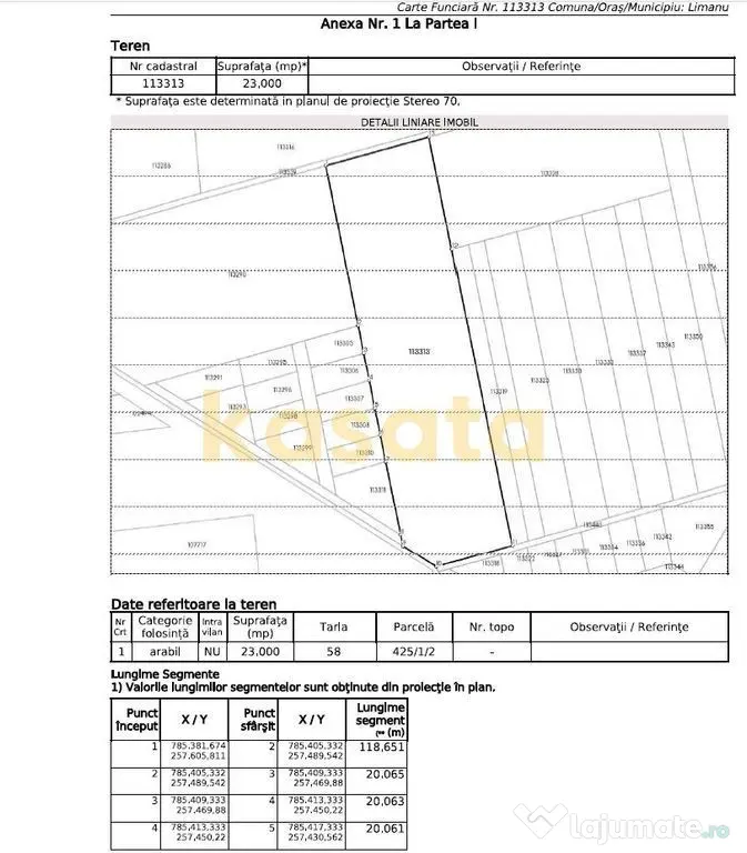 Terenul beneficiază de deschidere de aproximativ 21 ml la ambele capete, la două drumuri de pământ, asigurând acces facil pentru utilaje agricole. Parcela are o lungime de aproximativ 119 m, formă usor neregulată, ideală pentru exploatare agricolă eficientă.