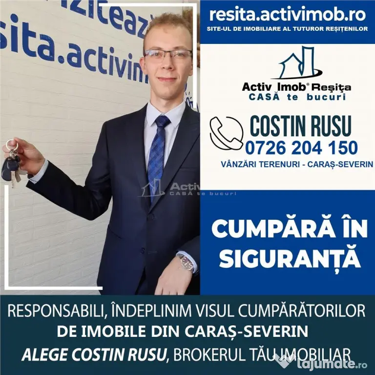 Daca si dumneavoastra aveti o proprietate in Judetul Caras-Severin si doriti sa o vindeti sau sa o inchiriati, va rugam sa sunati la numerele de telefon 0726 204 150 - Costin Rusu sau 0784 726 875 - Petre Culcea si vom crea un profil personalizat pentru vanzarea sau inchirierea acesteia, vizibil pe site-ul oficial de imobiliare: resita.activimob.ro Va multumim!