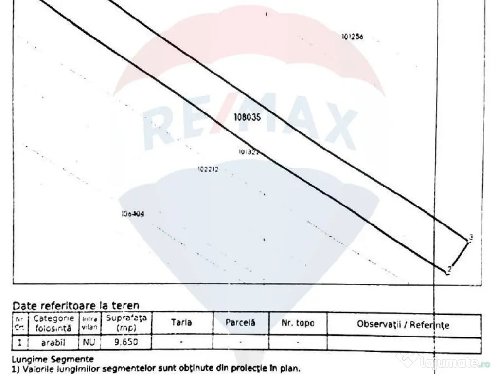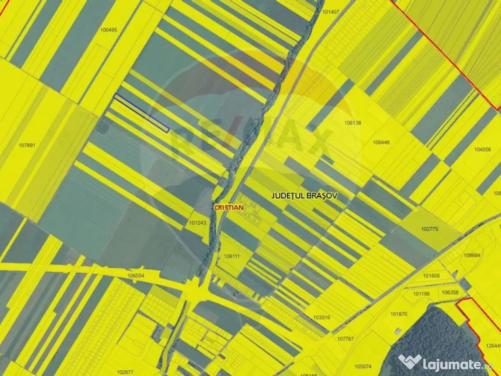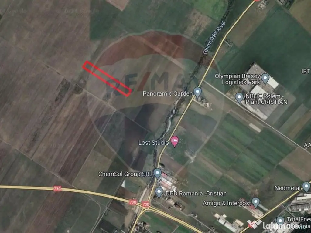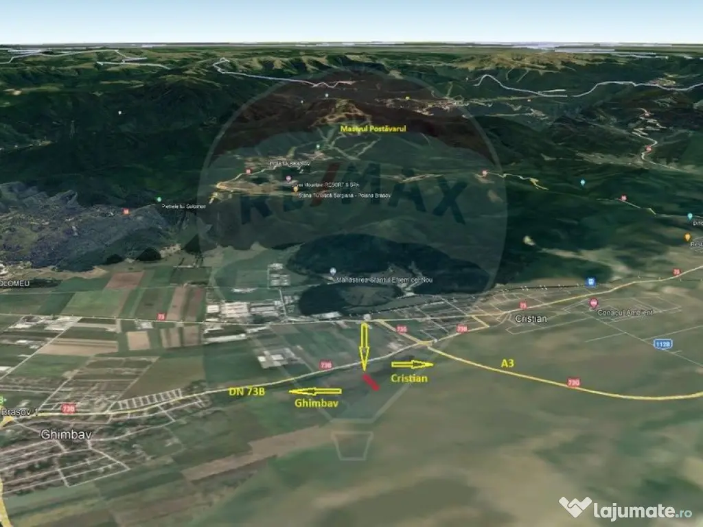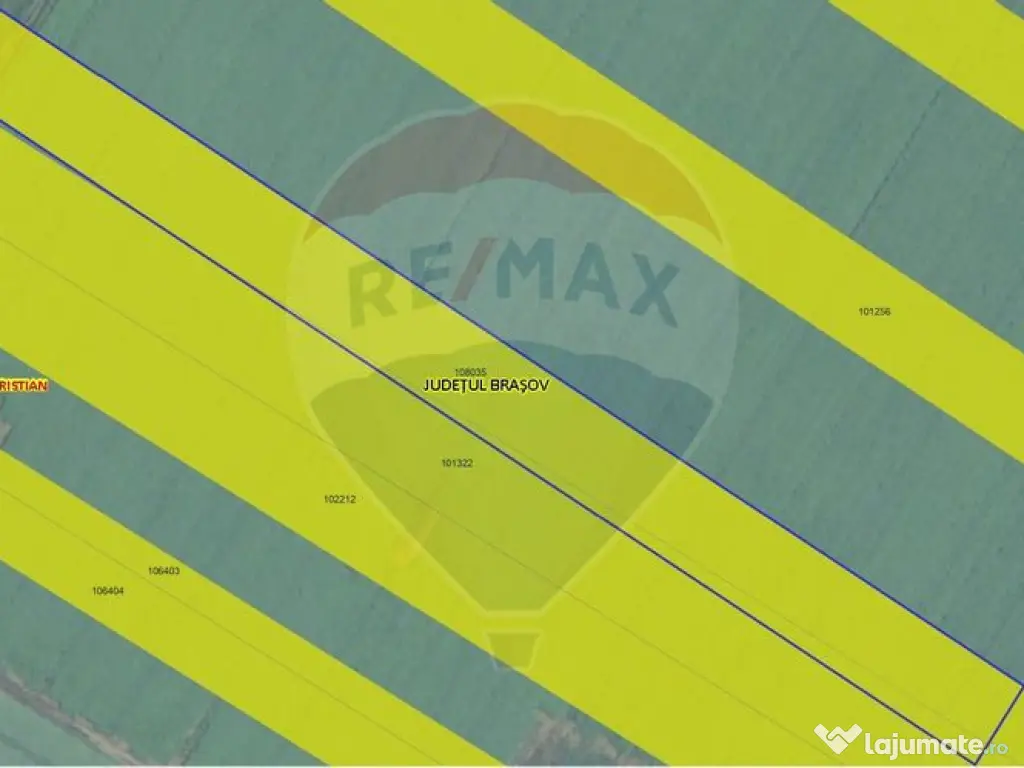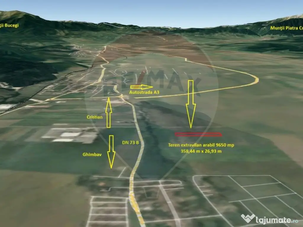 Vă propunem spre vânzare, în regim de reprezentare exclusivă, cu comision 0% din partea cumpărătorului: Teren extravilan, arabil, neîmprejmuit, 9650 mp, cu dimensiunile 358 m x 27 m, situat între Cristian şi Ghimbav, la 450 m de DN 73B, la 370 m de râul Ghimbăşel şi 12 km de Braşov. Accesul se face din Ghimbav, zona livezii, din strada Mestecenilor, pe o distanţă de 1,5 km pe un drum de pamânt până la teren. Vă mulțumim și vă stăm la dispoziție cu detalii suplimentare despre acest teren.