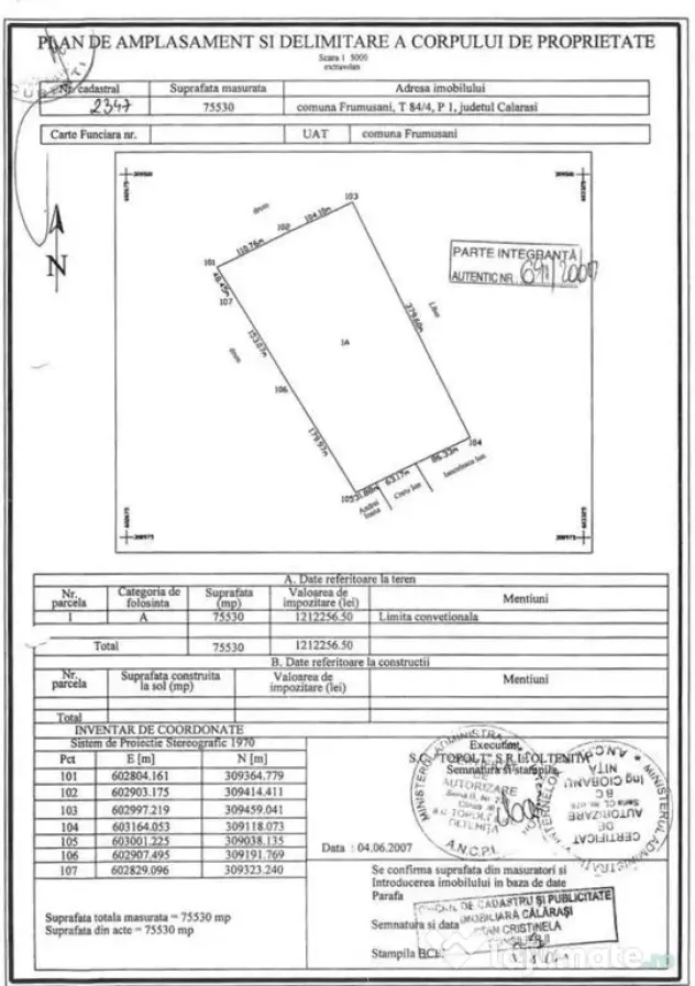 Va propunem spre achizitie un teren intravilan, arabil cu suprafata masurata de 75530 de metri patrati in Frumusani la 26 km distanta fata de centrul orasului Bucuresti. Are doua deschideri la drum, una de 381,49 de metri si cea de-a doua de 214,86 de metri.