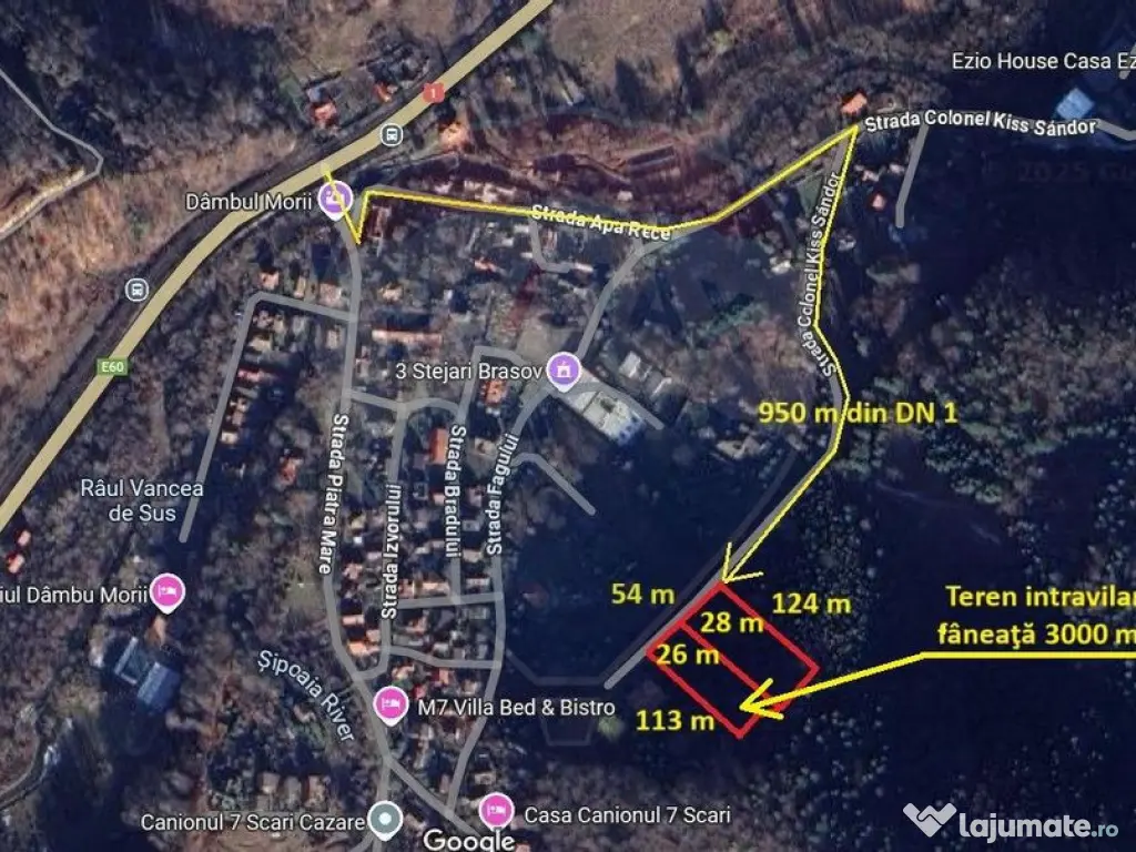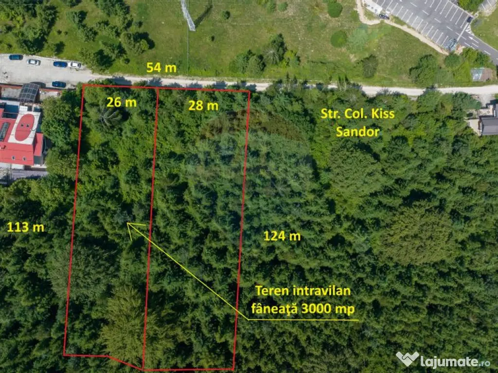 Teren intravilan, fâneaţă, neîmprejmuit, 3000 mp, situat la Dâmbu Morii, cu front de 26 m la strada Colonel Kiss Sandor şi adâncime de 123 m şi 113 m. Destinaţie conform PUG – UTR 40 – zona pentru construcţii turistice, vile, pensiuni şi dotări turistice. Necesar PUZ. Curentul, apa, canalizarea sunt la teren.