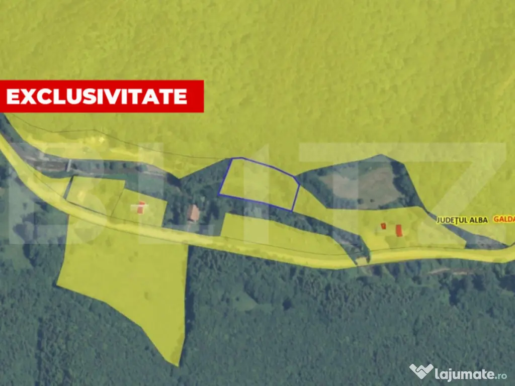 BLITZ propune spre vânzare un teren intravilan deosebit, situat în Poiana Galdei ???? ???? Punct de reper: Pensiunea Floare de Colț Terenul are o suprafață totală de 5.542 mp, este format din două parcele cu două CF-uri distincte, oferind flexibilitate în utilizare sau dezvoltare. Un element spectaculos al proprietății este râul Galda, care desparte cele două parcele, creând un cadru natural de poveste, ideal pentru iubitorii de natură, liniște și aer curat. ???? Caracteristici principale: Teren intravilan Suprafață totală: 5.542 mp 2 CF-uri Curent electric și apă în zonă (nu sunt trase pe parcelă) Acces facil până la proprietate Zonă turistică, cu pensiuni și restaurant în apropiere ???? Amplasarea este excelentă, la aproximativ 35 de minute de Alba Iulia, într-o zonă tot mai căutată pentru turism și relaxare. ✨ Destinații ideale: ????️ camping sau glamping ???? cabana mult visată ???? investiție turistică sau loc de retragere din agitația urbană Zona oferă peisaje deosebite, liniște, intimitate și un potențial excelent de dezvoltare. ???? Pentru mai multe detalii sau pentru programarea unei vizionări, vă așteptăm cu drag! Cod ofertă / ID BLITZ: P161788 Id intern: P161788
