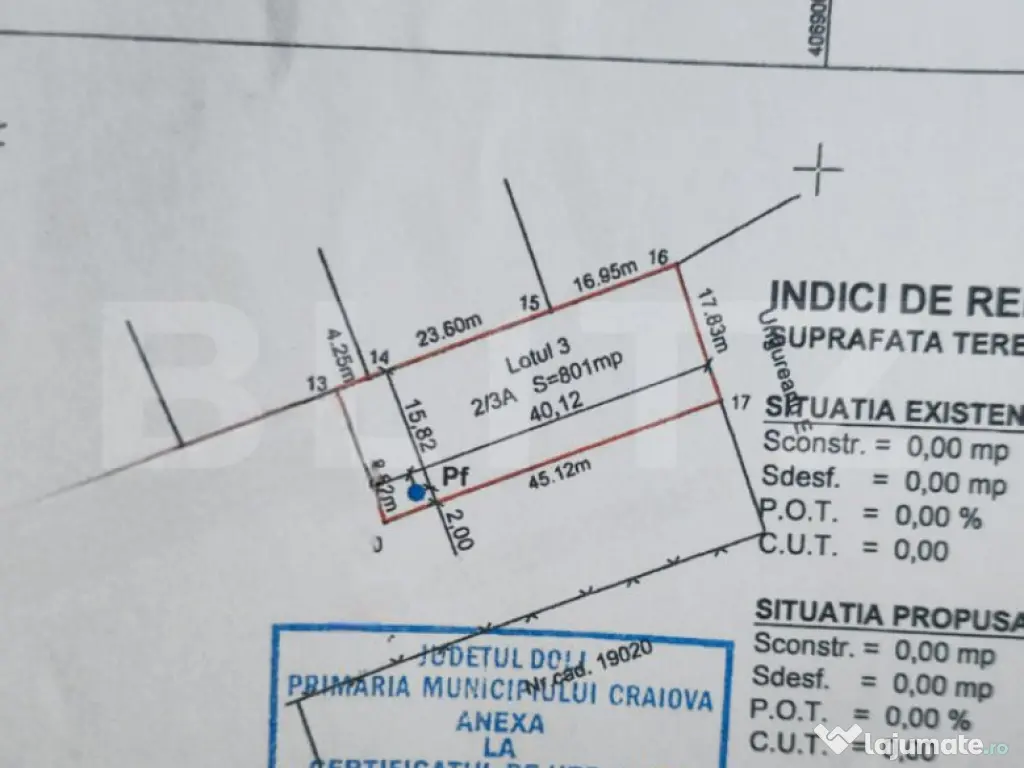 Oportunitate excelentă de achiziție în zona Bariera Vâlcii, aproape de Centura de Nord și noul Bulevard Malinului! Suprafață: 801 mp Acces: străzi asfaltate, cu ieșiri multiple spre punctele de interes ale orașului Utilități: curent, gaze naturale, apă și canalizare la rețea Acces facil: drum asfaltat și cale de acces de 9 metri latime Urbanism: teren în zona de locuințe individuale și funcțiuni complementare, regim de înălțime P+2, POT max 34%, C.U.T 0.90 Terenul face parte dintr-o parcelare recentă, situat într-o zonă formată și în continuă dezvoltare. Ideal atât pentru construcția unei locuințe personale, cât și pentru proiecte imobiliare. Va asteptam la vizionare cu mai multe detalii! Cod ofertă / ID BLITZ: P146831 Id intern: P146831