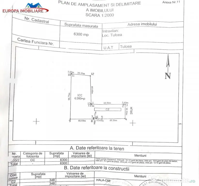 Europa Imobiliare va ofera spre vanzare, un teren intravilan situat in zona C.A.P. Tulcea cu suprafata de 6300 mp si deschidere de 30 m.l.