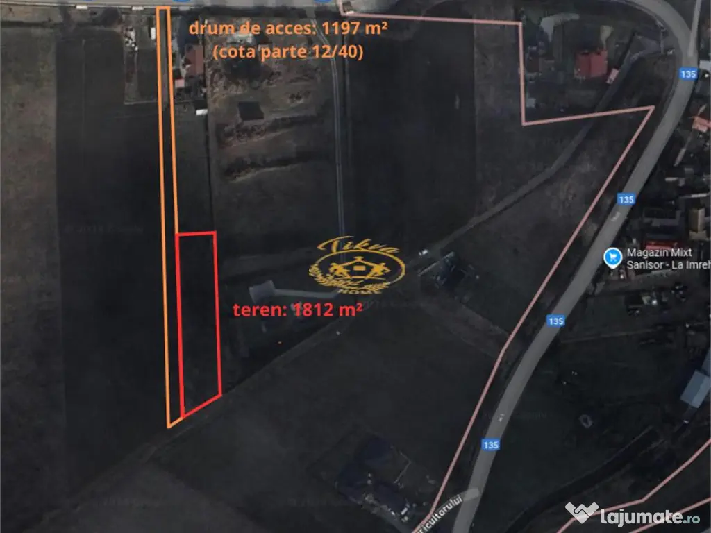 De vanzare teren intravilan pretabil pentru constructii in Sanisor (Com. Livezeni), jud. Mures, situat la intrarea in sat dinspre Targu Mures, la cca. 100 de metri de DJ135. Terenul are suprafata totala de 2171 msup2;, si se compune dintr-o parcela de 1812 msup2;, plus 359 msup2; (reprezentand cota parte de 12/40) din terenul vecin, care poate fi utilizat ca drum de acces. Terenul poate fi accesat si de pe un alt drum, care se deschide tot din DJ135. Are deschiderea de 98 metri la primul drum de acces si de 23 metri la celalalt drum de acces. Utilitatile (curent, apa, canalizare) sunt disponibile in apropierea terenului. Pret: 23 EUR/msup2; (in total: 49.900 EUR) - negociabil. Comision cumpărător: 0%