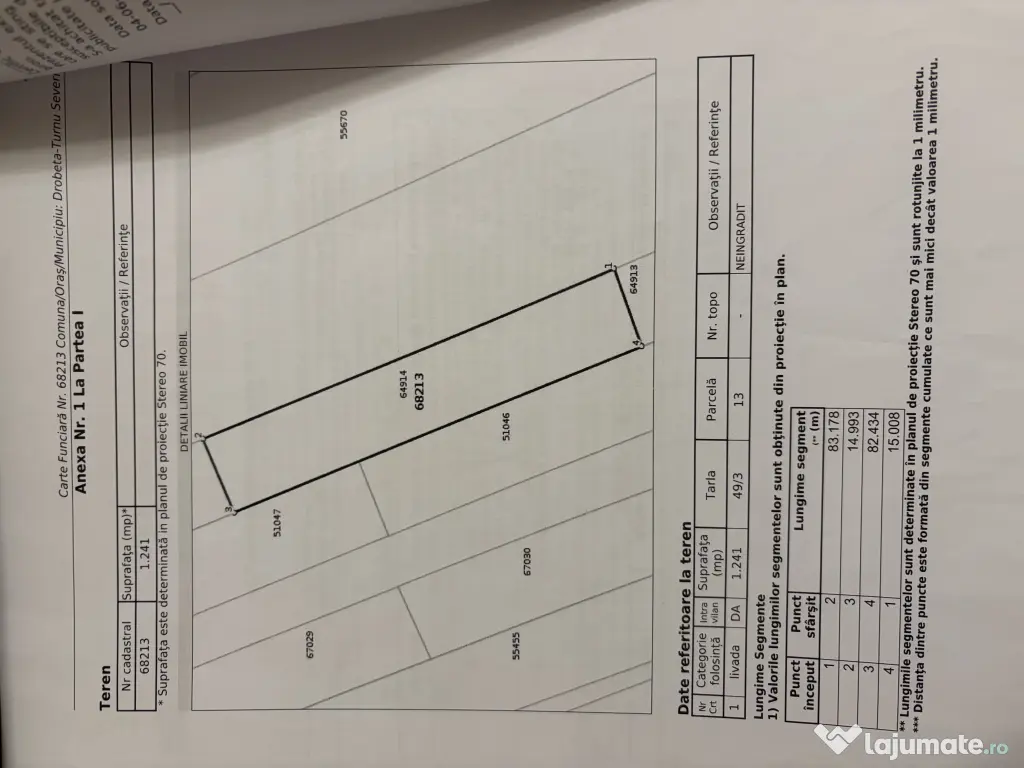 Utilitati: Posibila racordare la apa si curent, distanta fiind la aproximativ 100 de metrii de teren. Racordarea la canalizare va fi posibila cand va incepe primaria asfaltarea zonei.