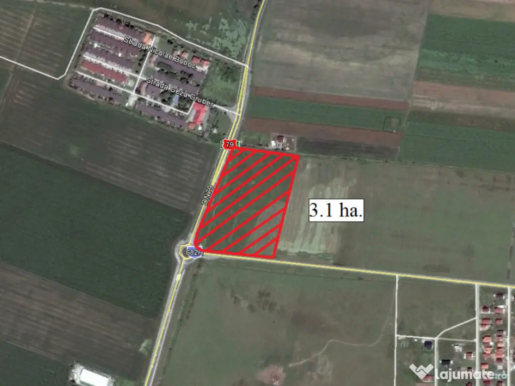 Vand teren intravilan 3.1 ha. la intersectia drumului national Arad-Oradea cu drumul spre Livada, teren pe colt cu 2 fronturi stradale. Terenul are PUZ pentru constructia de hale, zona de servici si case, utilitati la poarta : apa, gaz, curent, canalizare. Pret : 15 euro/mp. ID : RH-7498-property