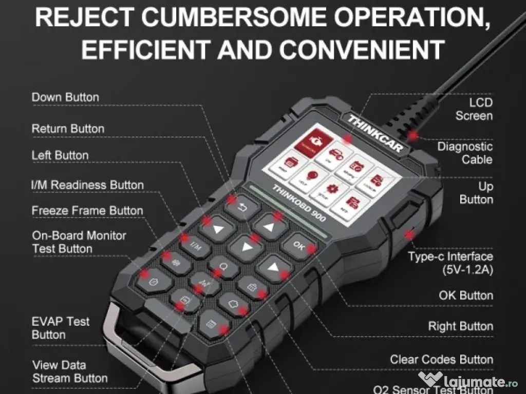 THINKOBD 900 este un model îmbunătățit al THINKOBD 500. Dispune de un ecran mare color de 2,8 inch și 9 taste rapide, care fac diagnosticul mai eficient și mai simplu.