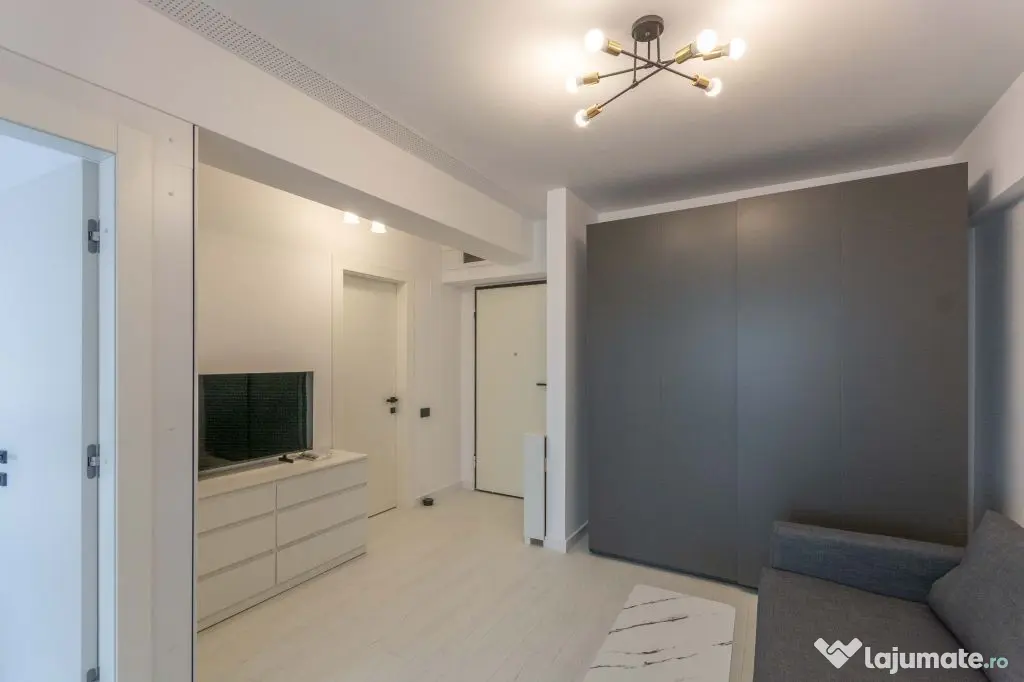 Compartimentarea este eficienta, impartita in zona de zi si zona de seara separata prin usa. Chiar daca este garsoniera, impartirea spatiului este optim, transformand-o intr-un veritabil studio.