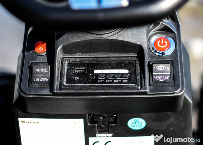 Benficiati de GARANTIE 24 Luni Transport GRATUIT Pentru comenzi si info contactati-ne 0729189471 2 motore electric de putere 55W fiecare la tensiune 24V, total 110W 24V Roti MOI din cauciuc EVA, silentioase si confortabile Echipat cu baterie detasabila, 24V 10Ah total Scaun tapitat cu piele ecologica, confortabil pentru 1 copil Pedala pentru acceleratie Dupa eliberarea pedalei, tractorasul incepe sa franeze Schimbare directie de mers inainte/inapoi din comutator Scaun din plastic, confortabil pentru 1 copil Remorca inclusa, aceasta este detasabila si basculabila Music player cu port USB, conexiune Jack Mp3 si comenzi divertisment Pornire/Oprire din Buton a sistemului de alimentare 24V Comutator pentru schimbarea sensului de mers inainte sau inapoi Comutator pentru setare putere motoare, high / low speed Comutator pentru activare / dezactivare sistem iluminat cu LED Pornire LENTA pentru confortul copilului Oprire LENTA pentru confortul copilului Echipata cu BATERIE reincarcabila 24V 10Ah Produsul include INCARCATOR, TELECOMANDA, manuale utilizare CONTROL PARENTAL prin telecomanda de la distanta 3 nivele de viteza selectabile din telecomanda Tractorasul mai poate fi ghidata manual de catre copil Volan echipat cu butoane pentru activare efecte sonore Indicator nivel baterie pe display music player Conexiune Mp3 prin cablu jack, inclus Centura de siguranta Greutate proprie 27.8 kg Greutate total admisa 57.8 kg Produs recomanda pentru copil 36-96 luni Dimensiunile produsului montat fara remorca 111x63x71 cm Dimensiunile produsului montat cu remorca 182x63x71 cm Puteti cumpara acest produs in RATE, fara dobanda, cu CARD de cumparaturi de la banci partenere precum: Raiffeisen / Star BT / BCR / BRD Finance / Alpha Bank /First Bank. Pentru comenzi si info contactati-ne 0729189471 SAU IN RATE CU DOBANDA PRIN TBI PAY.